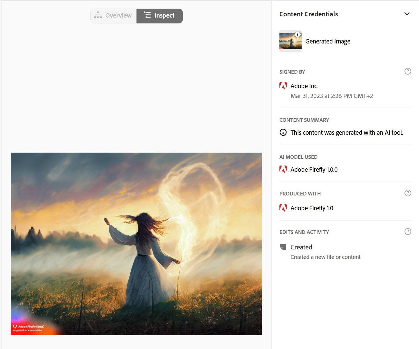 Pierwszym dostawcą, który zdecydował się na cyfrowe oznaczanie tworzonych przez siebie grafik był Adobe. Serwis Adobe Firefly jest wciąż w fazie testów beta, lecz grafiki nim utworzone są oznaczane nie tylko łatwo widocznym znakiem graficznym, lecz zawierają także podpis cyfrowy identyfikujący je jako prace wygenerowane przez AI. Wadą rozwiązania przyjętego przez Adobe, nazywanego Content Credentials, jest ograniczenie weryfikacji (przynajmniej w tej chwili) do aplikacji producenta – podpis nie jest widoczny w innych programach. Jest to jednak kwestia czasu, gdyż Adobe bazuje na standardzie stworzonym przez C2PA (Coalition for Content Provenance and Authority).