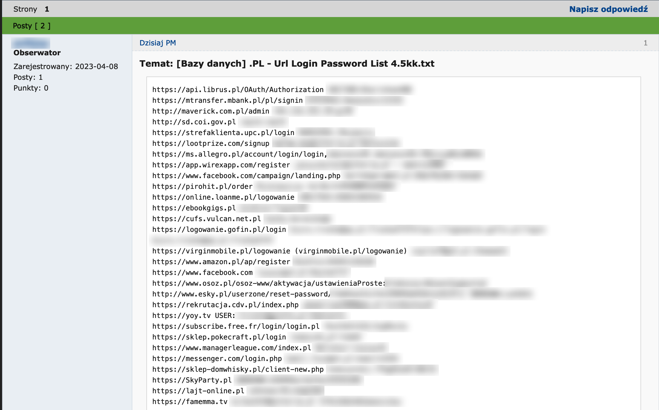 O wycieku poinformował po raz pierwszy portal Zaufana Trzecia Strona, zajmujący się tematyką bezpieczeństwa. Dane zostały opublikowane na forum Cebulka w sieci Tor. Plik nazywa się pl.txt i zawiera 6 274 679 wierszy zawierających adres strony, login oraz hasło. Część wierszy zawiera dane niekompletne lub uszkodzone, lecz większość wygląda zupełnie poprawnie.