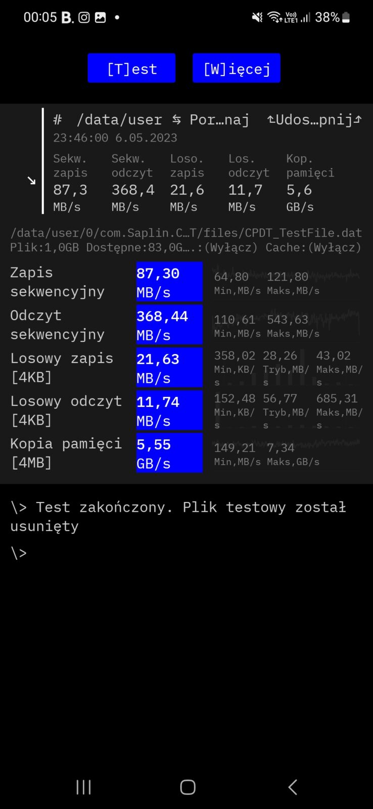 W benchmarkach różnice między smartfonami są niewielkie i trudno wskazać wydajniejsze urządzenie. Z pewnością wśród używanych urządzeń znajdziecie wydajniejsze propozycje – obydwa smartfony mają poziom porównywalny do Snapdragona 778G, a to procesor obecny na rynku od dwóch lat. Uruchamianie aplikacji odbywa się płynnie, ale na każdy program musimy nieco poczekać. Samsung ponownie ogranicza potencjał zapisu pamięci w benchmarkach, więc wyniki nie są miarodajne. W rzeczywistości zapisywanie plików podczas renderowania filmów, instalowania aplikacji czy robienia zdjęć przebiegają standardowo.