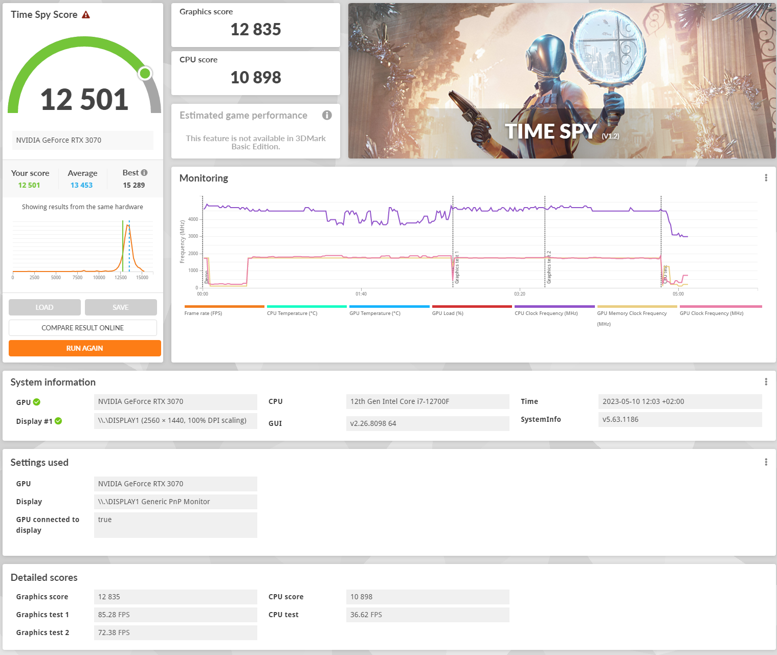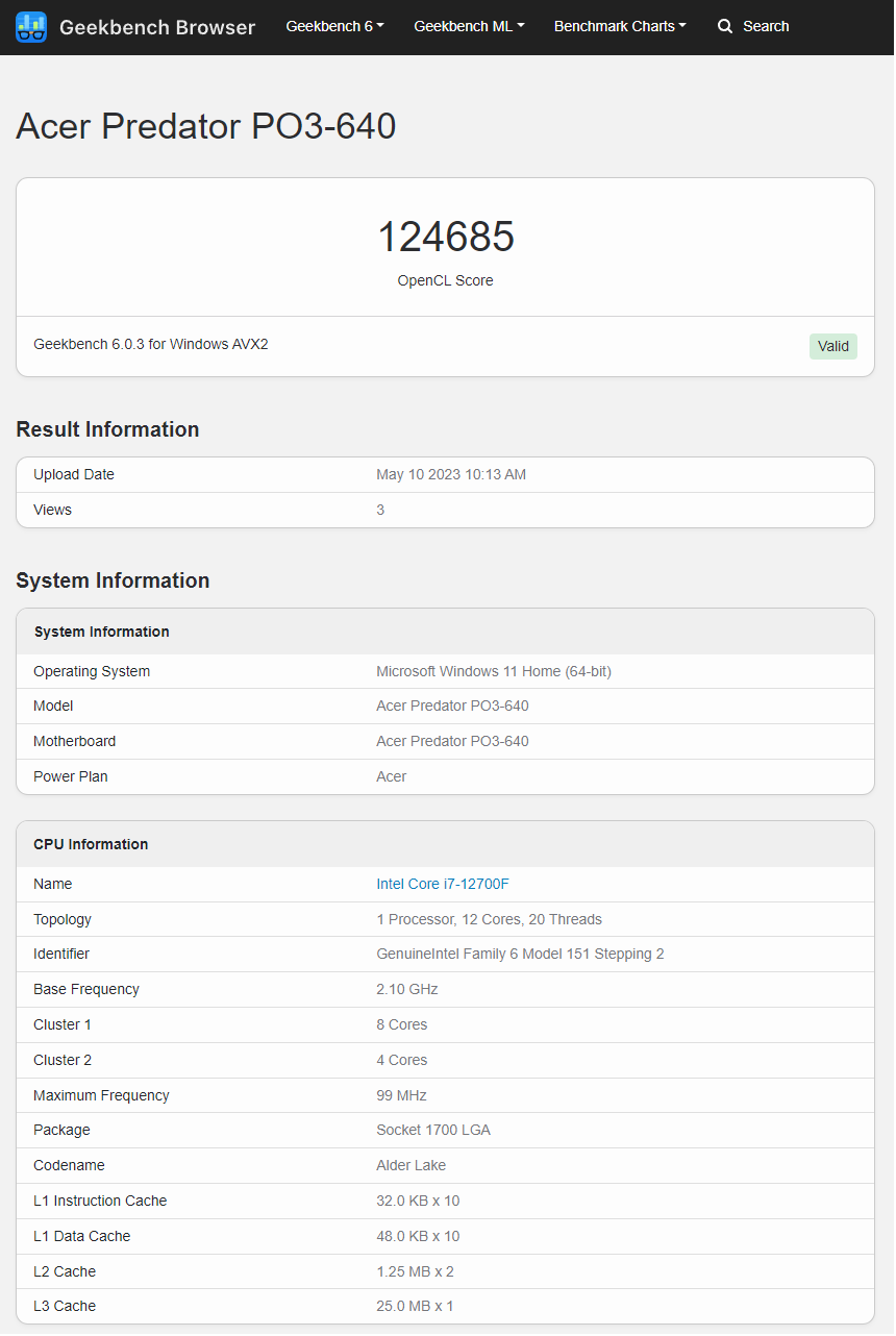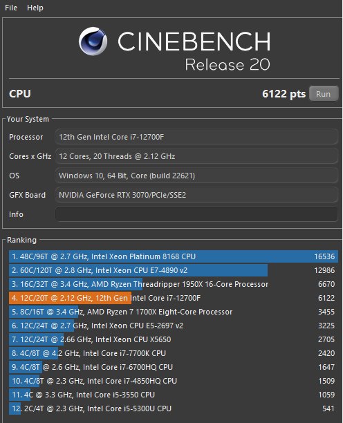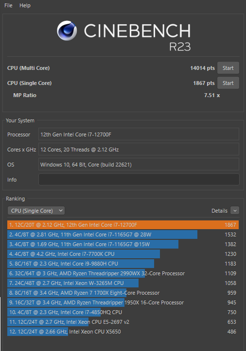 Jeśli chodzi o syntetyczną wydajność, to Cinebench R23 dobrze pokazuje wydajność poszczególnych rdzeni. Tutaj widzimy, że nasz procesor Intel Core i7-12700F osiąga bardzo dobre wyniki. Ostatecznie odnotowuje 14014 punktów w teście wielordzeniowym i 1867 punktów w teście jednordzeniowym. W teście Cinebench R20 Orion 3000 osiągnął wynik 6122 punktów i również nie rozczarowuje. W teście Geekbench 6 udało się uzyskać rezultat na poziomie 124685 punktów, w 3DMark Timespy był to wynik 12501.
