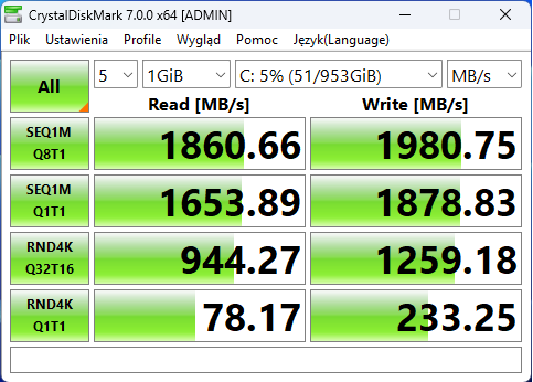 Prędkości dysku SSD z połączeniem PCIe 3.0 x4 są na oczekiwanym poziomie. W zupełności wystarcza do codziennego użytku i najczęściej wykonywanych zadań.