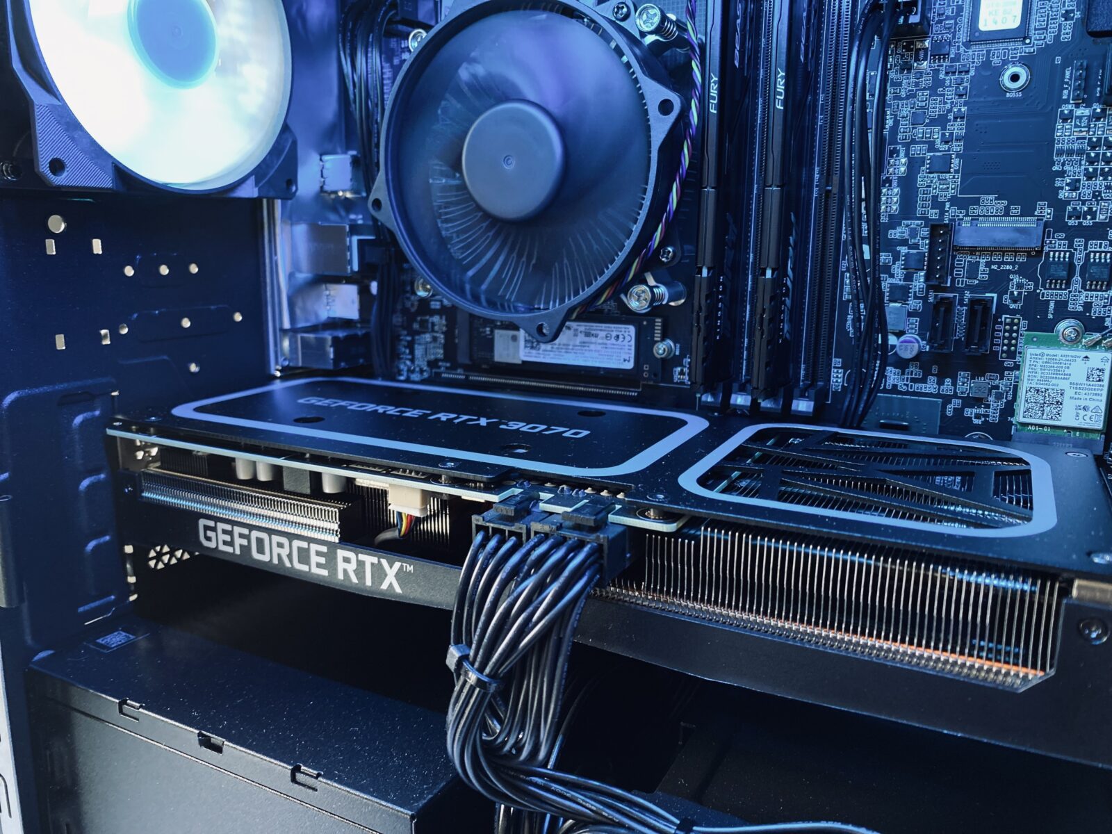 Jak na komputer gamingowy przystało, mamy tu zatrzęsienie LED-ów. W Orionie 3000 mamy do wyboru kilka stref podświetlenia, które możemy dowolnie konfigurować. Oczywiście da się je również wyłączyć, jeśli wolimy mniej krzykliwe środowisko cyfrowej rozrywki. Brakuje podświetlenia samych kości pamięci RAM, ale to tylko drobny szczegół.