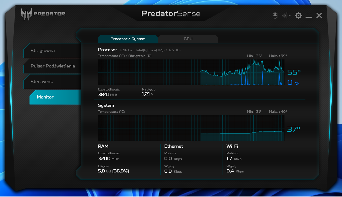 Predator Orion 3000 jest fabrycznie wyposażony w system Windows 11 w wersji Home. Wśród domyślnie zainstalowanych aplikacji znajdują się dwie specjalnie zaprojektowane dla komputerów serii Predator. Jedna z nich służy do obsługi dołączonych urządzeń peryferyjnych, zaś druga (PredatorSense) to swoiste centrum kontroli do monitorowania parametrów pracy całego systemu, regulacji pracy wentylatorów oraz konfiguracji systemu podświetlenia.