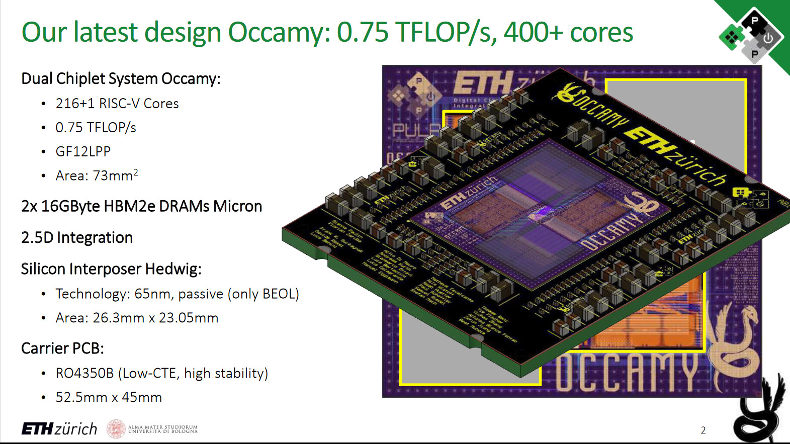 Efektem prac inżynierów ma być finalnie w pełni sprawny procesor z około miliardem tranzystorów w formie pakietu wieloukładowego krzemu o powierzchni 72 milimetrów kwadratowych, który zostanie umieszczone na płytce PCB o wymiarach 52,5×45 mm przeznaczonej już do montażu w docelowym komputerze. Na tę powierzchnię składają się też dwie pamięci HBM2E DRAM firmy Micron o łącznej pojemności 32 GB. Więcej danych na temat jego możliwości doczekamy się już w trzecim kwartale bieżącego roku, kiedy już Occamy zostanie w pełni zmontowany i finalnie poddany testom.