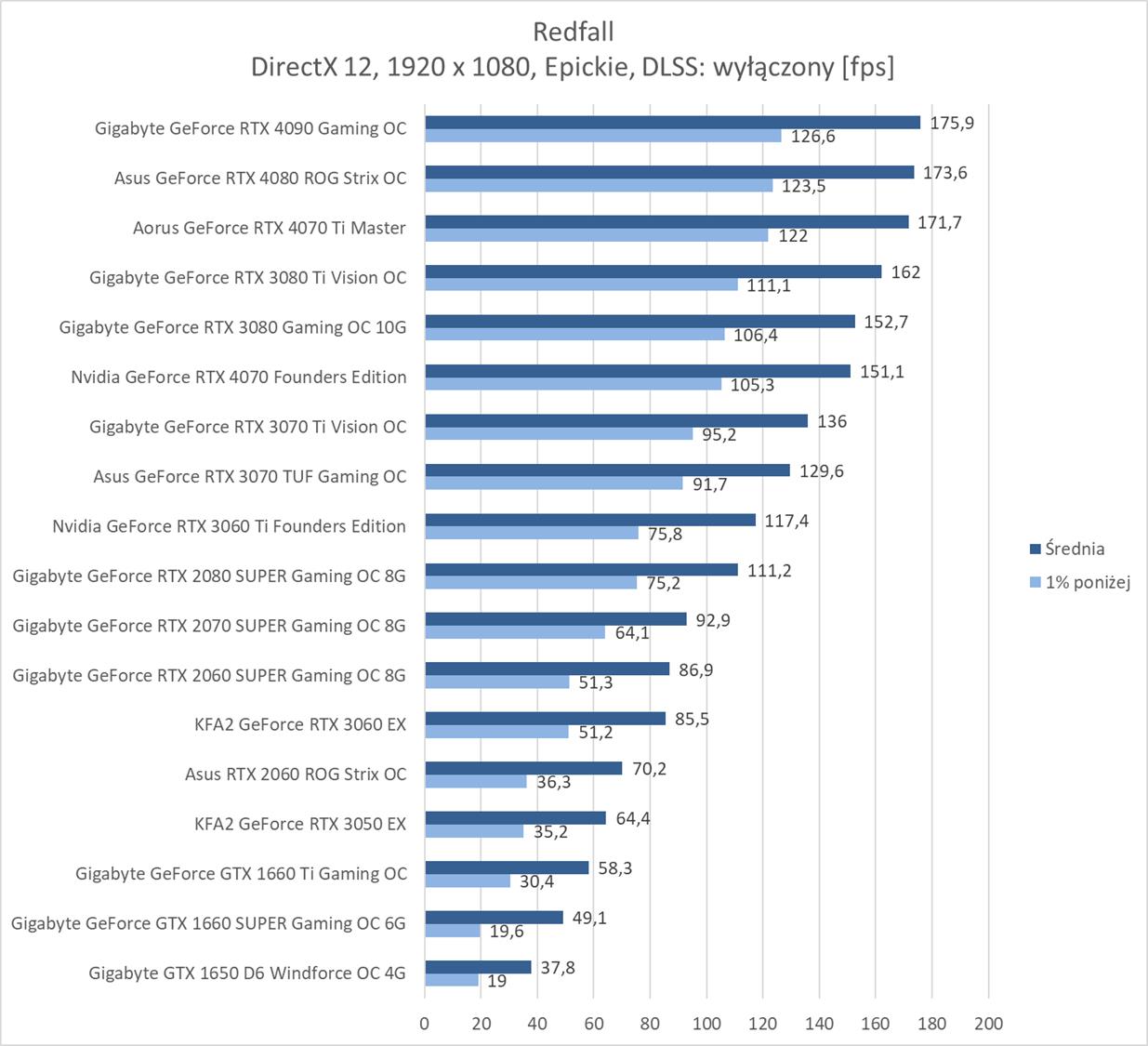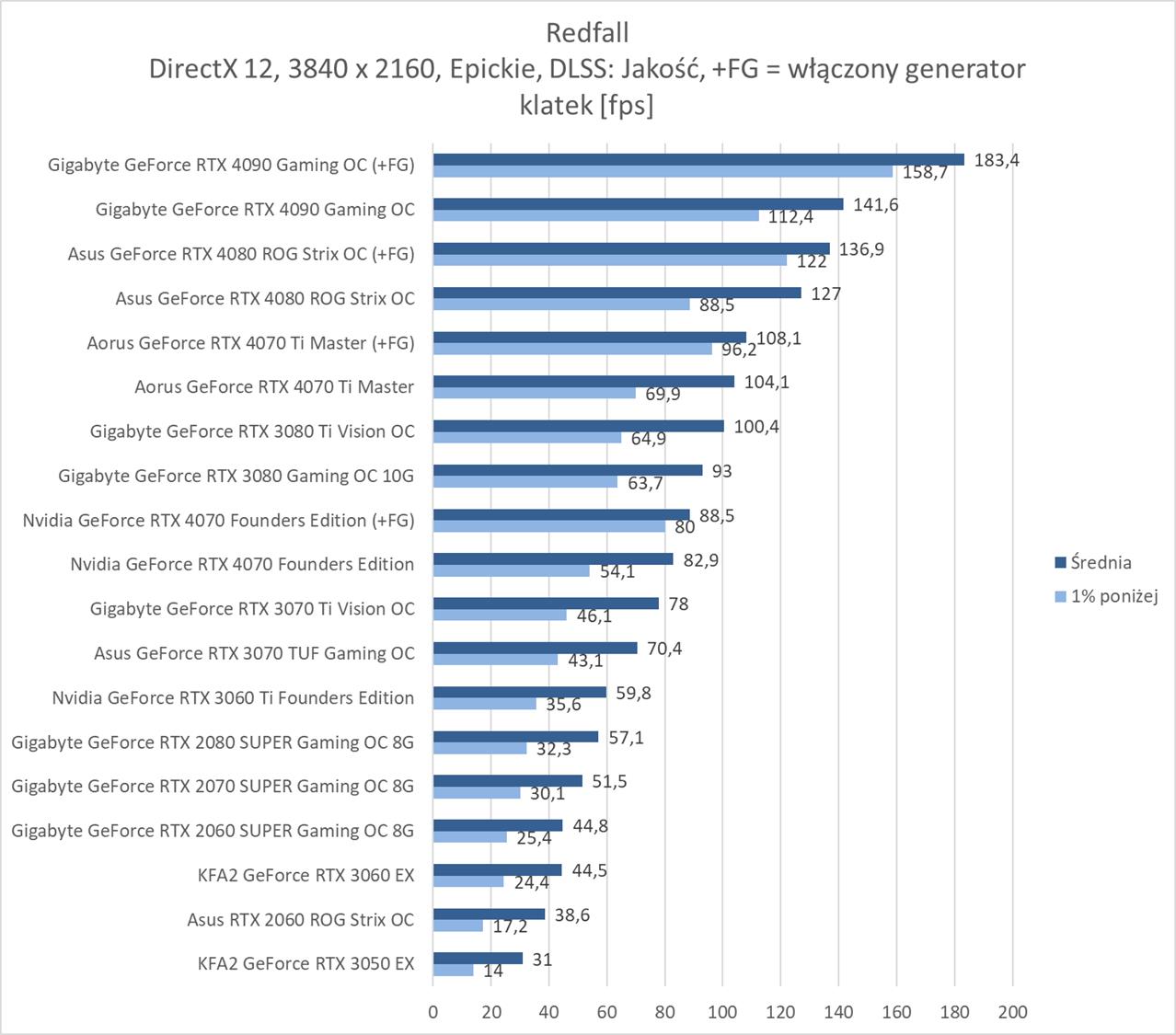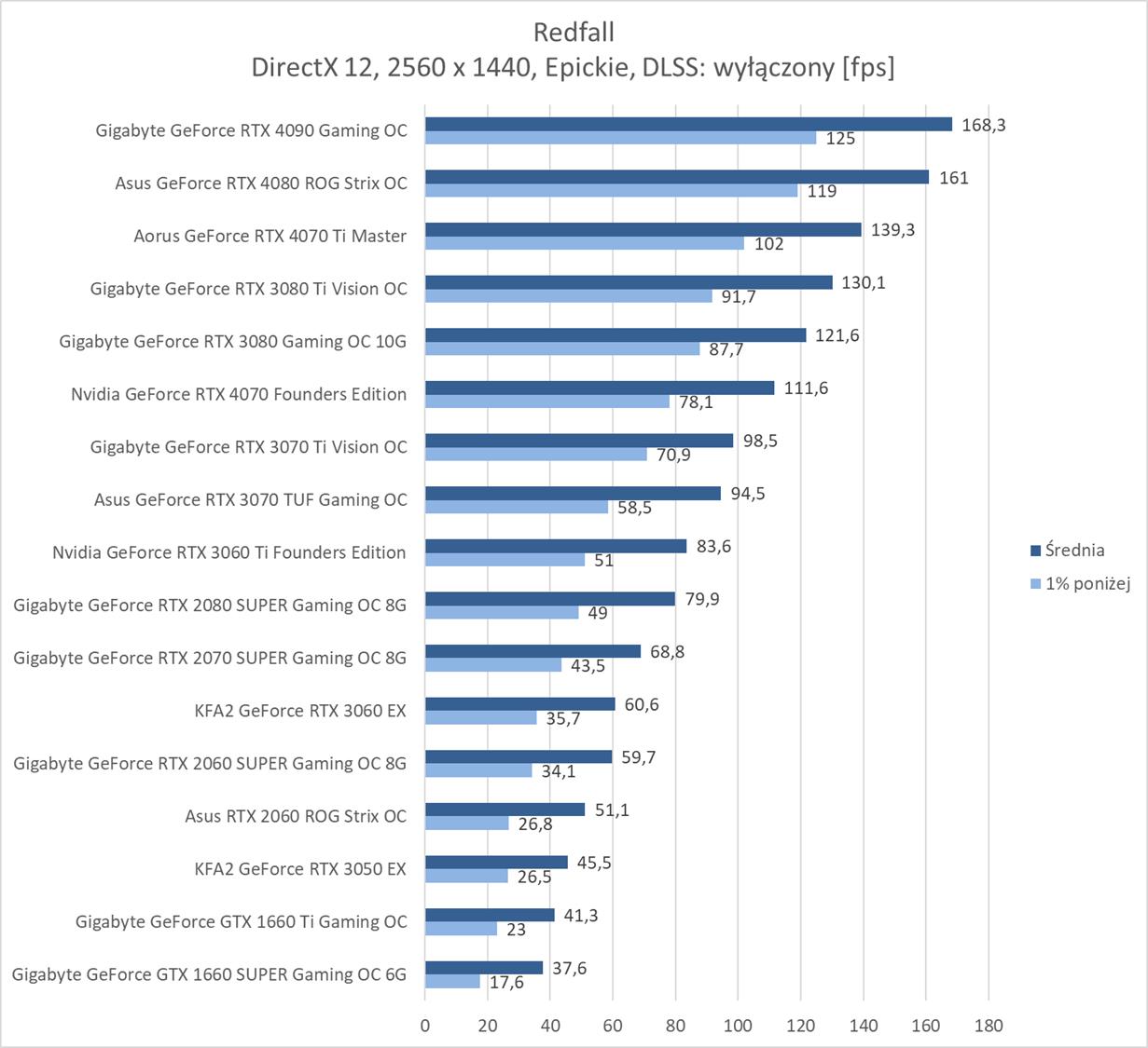 Redfall nie wydaje się zbytnio wymagającym tytułem. Średnio 60 fps osiągniecie w 1920 x 1080 już na RTX 3050, w 2560 x 1440 na RTX 3060 (2060 SUPER minimalnie zabrakło), a w 3840 x 2160 na RTX 3080 (RTX 4070 czy 3070 Ti są naprawdę blisko). Trzeba jednak pamiętać o 1% poniżej, który tutaj wypada dosyć słabo. Możecie więc osiągnąć średnio 59,6 fps np. w 4K, ale 1% poniżej będzie na poziomie 35,8 fps. Dotyczy to wszystkich kart we wszystkich rozdzielczościach i nawet jeśli wystarczy Wam np. 45 fps to z 1% poniżej mniejszym niż 30 fps nie ma zbytnio mowy o płynnej rozgrywce.