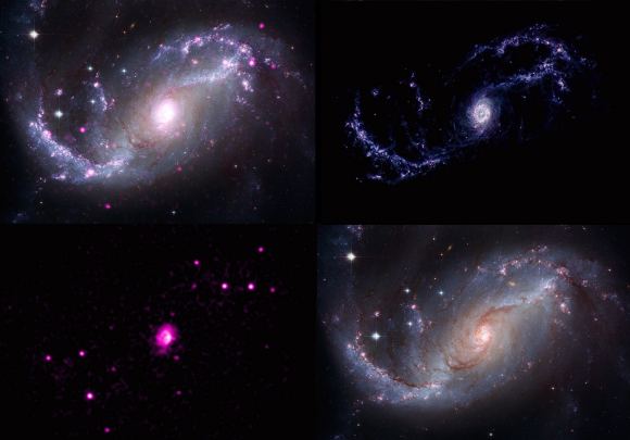 W przypadku galaktyki spiralnej NGC 1672 mówimy natomiast o obecności gwiazd neutronowych i czarnych dziur. Sporych rozmiarów fioletowy obłok wskazuje na istnienie supermasywnej czarnej dziury. NGC 1672 jest określana mianem galaktyki spiralnej z poprzeczką, a dzięki JWST wiemy, iż jej ramiona zawierają liczne gwiazdy, natomiast wokół samej poprzeczki można dostrzec obłoki gazu, pyłu i kolejne gwiazdy. Dzięki zgromadzonym danym naukowcy są w stanie określić koncentrację gazu i pyłu.