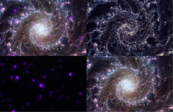 Na samym końcu mamy natomiast Messier 74, czyli galaktykę spiralną nieco przypominającą Drogę Mleczną. Dzięki zdjęciom wykonanym przez teleskop Webba astronomowie dostrzegli tamtejsze ramiona spiralne, jasne jądro, lokalizacje gwiazd o zróżnicowanym wieku i rozmiarach, a także chmury pyłu i gazu. Wkład obserwatorium Chandra polegał natomiast na zobrazowaniu wysokoenergetycznej aktywności obejmującej młode i masywne gwiazdy.