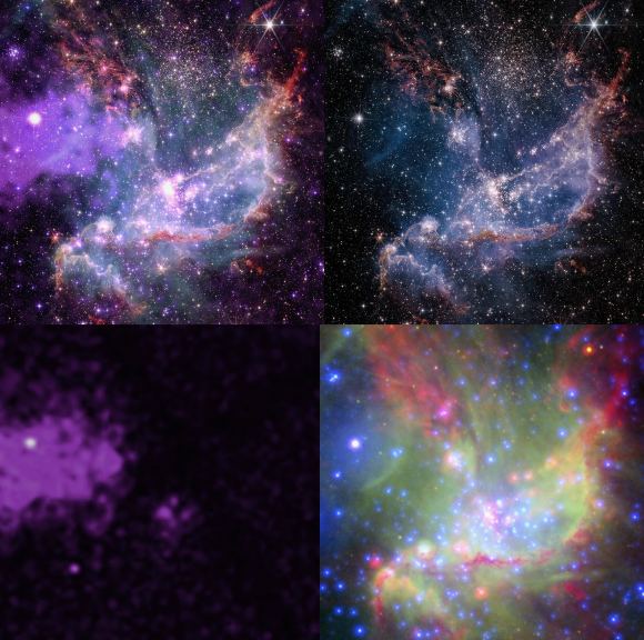 Zdjęcia zostały zestawione tak, by pokazywały poszczególne obiekty w konkretnych okolicznościach. Na przykład gromada NGC 346 została zaprezentowana pod kątem złożonych danych, danych w podczerwieni, rentgenowskich oraz wymieszanych danych w podczerwieni, optycznych i rentgenowskich. Różne długości fal znajdują odzwierciedlenie w kolorze fioletowym (promieniowanie rentgenowskie), czerwonym, zielonym i niebieskim (optyczne) oraz czerwonym i pomarańczowym (podczerwone). Dzięki Webbowi możemy dostrzec obłoki gazu i pyłu przyczyniające się do narodzin gwiazd, podczas gdy Chandra wskazuje na istnienie pozostałości supernowej oraz kilku młodych gwiazd.