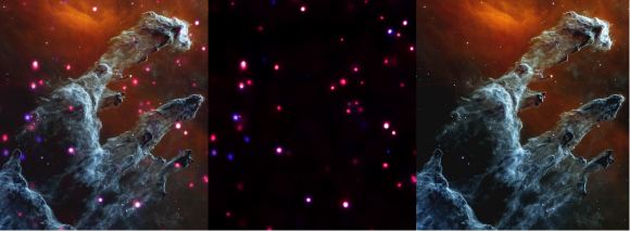 Mgławica Orzeł, słynąca z posiadania popularnych Filarów Stworzenia, została uwieczniona dzięki kombinacji obrazów w podczerwieni i promieniowaniu rentgenowskim. Ciemne obłoki gazu i pyłu są tam otoczone ciemnopomarańczową mgiełką, która najprawdopodobniej stanowi przykład rozproszonego gazu i pyłu podświetlonego w średniej podczerwieni. Z kolei Chandra dostarcza informacji na temat masywnych, niedawno uformowanych gwiazd, widocznych w formie różowych i fioletowych kropek stanowiących przykład emisji promieniowania rentgenowskiego.