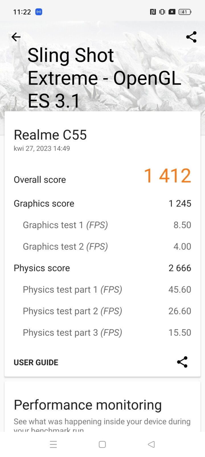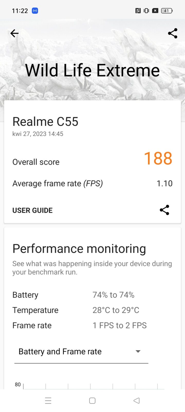 Jak widać realme C55 to nie jest gamingowa maszyna, z której będą zadowoleni zapaleni gracze. Oczywiście zdecydowaną większość gier da się tu bez problemu uruchomić, ale w przypadku wymagających produkcji trzeba będzie obniżyć detale do minimum, jeśli zależy nam na zachowaniu płynności rozgrywki. Na plus należy zaliczyć za to kulturę pracy. Telefon nie nagrzewa się zbytnio, nawet podczas długotrwałego obciążenia. Wydajność na szczęście wtedy również nie spada, co potwierdzają wyniki na poziomie 99% w stresstestach.