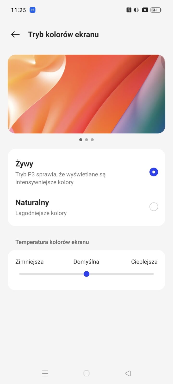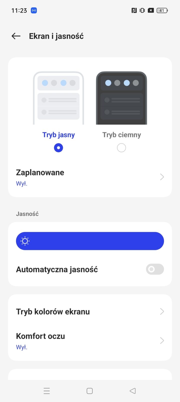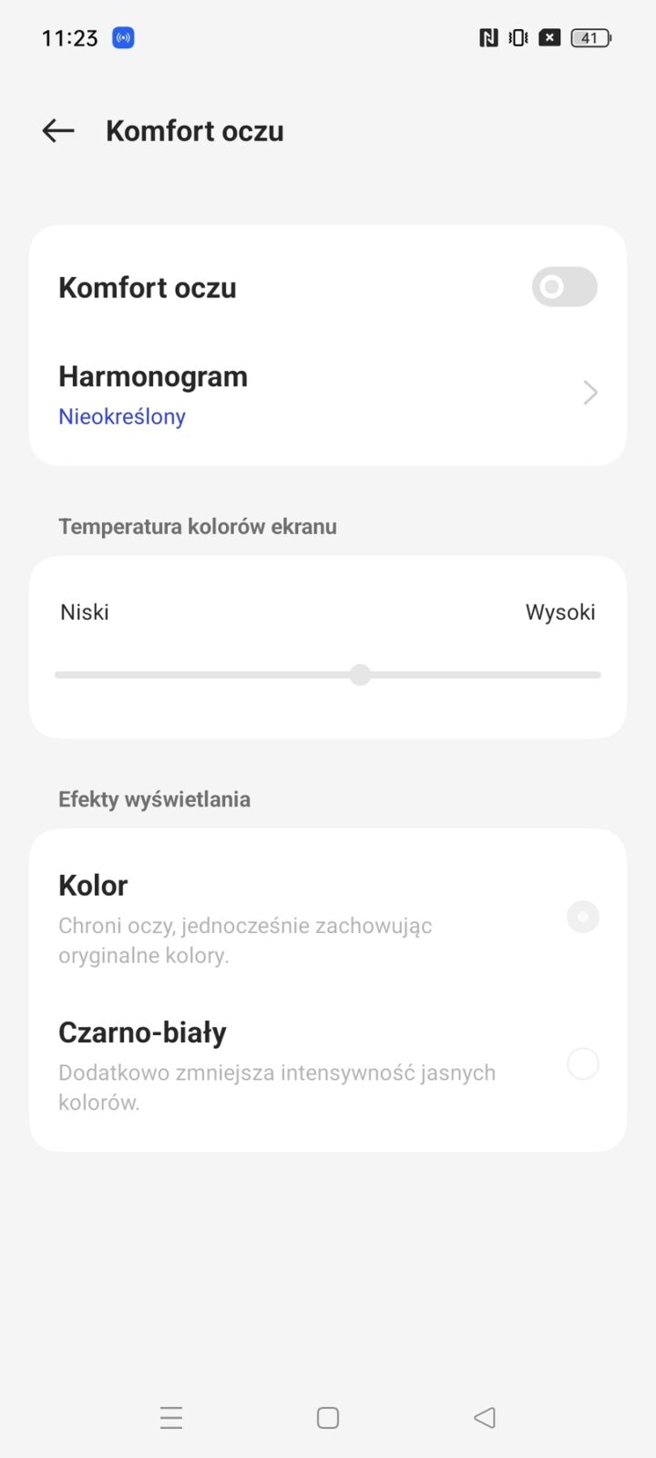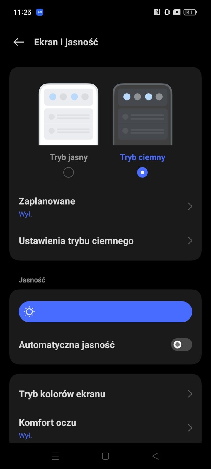 W ustawieniach znajdziemy tryb ciemny dla menu oraz możliwość regulacji barw i częstotliwości odświeżania ekranu. Brak Always on Display jest zapewne podyktowany zastosowaną matrycą (to nie Amoled) i brakiem możliwości punktowego świecenia pikseli.