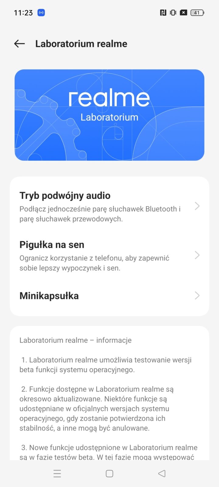 P.S. W ustawieniach, w pozycji „laboratorium realme” możemy znaleźć eksperymentalną funkcję – „tryb podwójny audio”, który pozwala odtwarzać dźwięk jednocześnie zarówno na słuchawkach przewodowych, jak i bluetooth. Co prawda jest różnica w czasie przesyłu dźwięku (przez bluetooth są opóźnienia), ale ogólnie funkcja działa.
