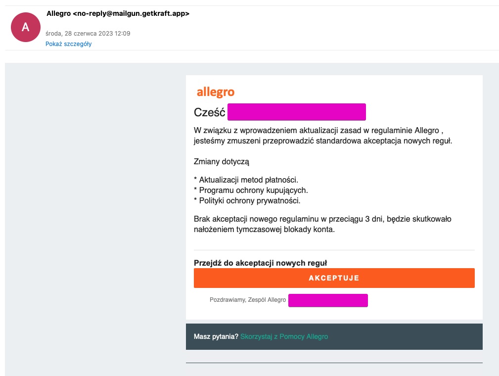 Tym razem przestępcy wzięli na celownik użytkowników najpopularniejszego serwisu sprzedażowego w Polsce. Jak poinformował Niebezpiecznik, Polacy zaczęli otrzymywać wiadomości e-mail z informacją o aktualizacji regulaminu. To dość dobry pretekst na wyłudzenie danych, bo przecież Allegro raz na jakiś czas przesyła takie wiadomości. Jeśli nie sprawdzimy wszystkiego dokładnie, to możemy łatwo paść ofiarą oszustwa. Brak akceptacji nowych warunków może skończyć się tymczasową blokadą konta, a tego raczej nikt nie chce.
