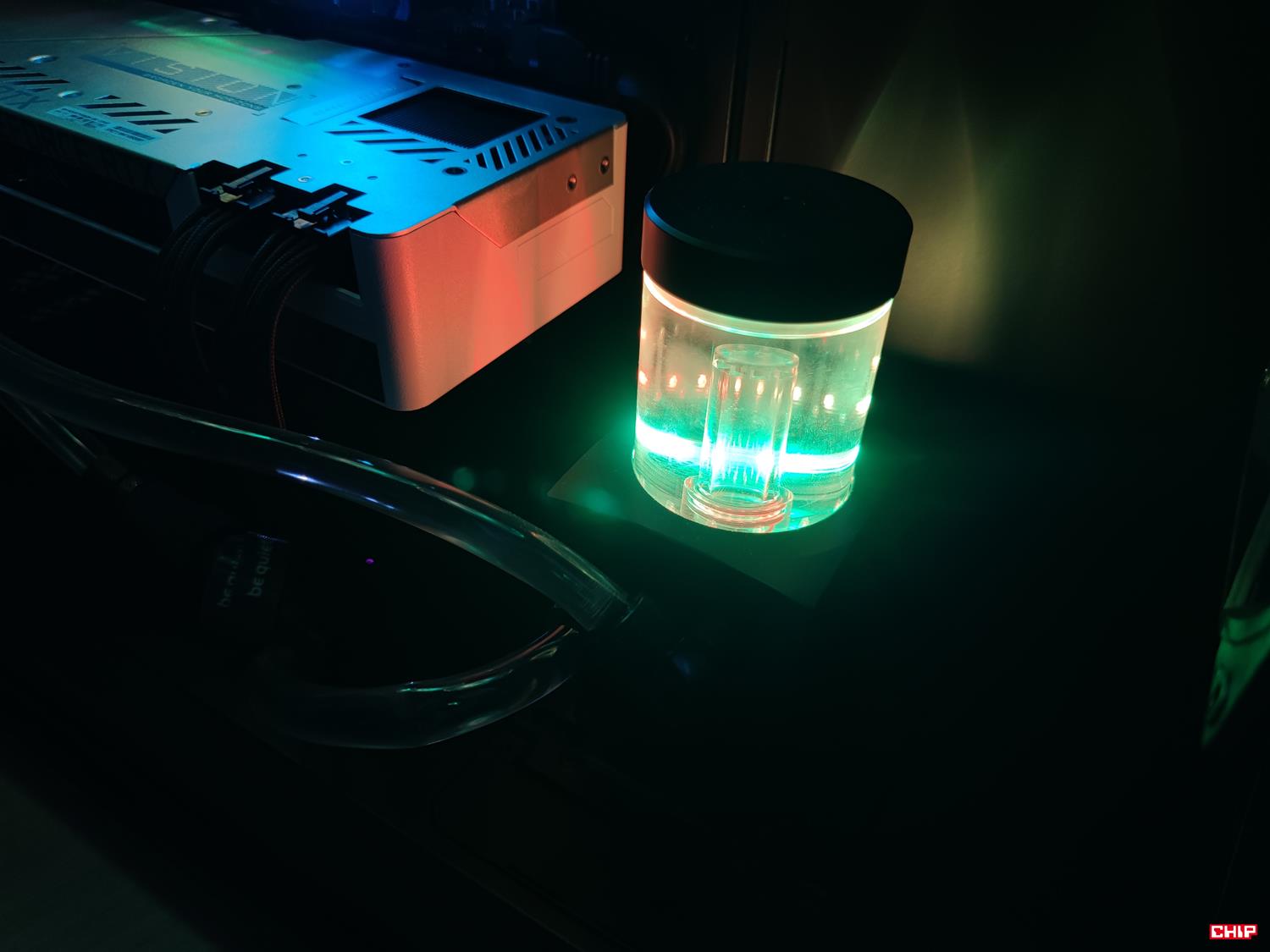 Rezerwuar ma wymiary 131 × 76,5 × 76,5 mm i pojemność 200 ml. Otwór do nalewania znajduje się na górze i naprawdę prosto można uzupełnić poziom cieczy w układzie. Ma też podświetlenia ARGB, które wygląda świetnie — rezerwuar jest naprawdę mocno rozświetlony.