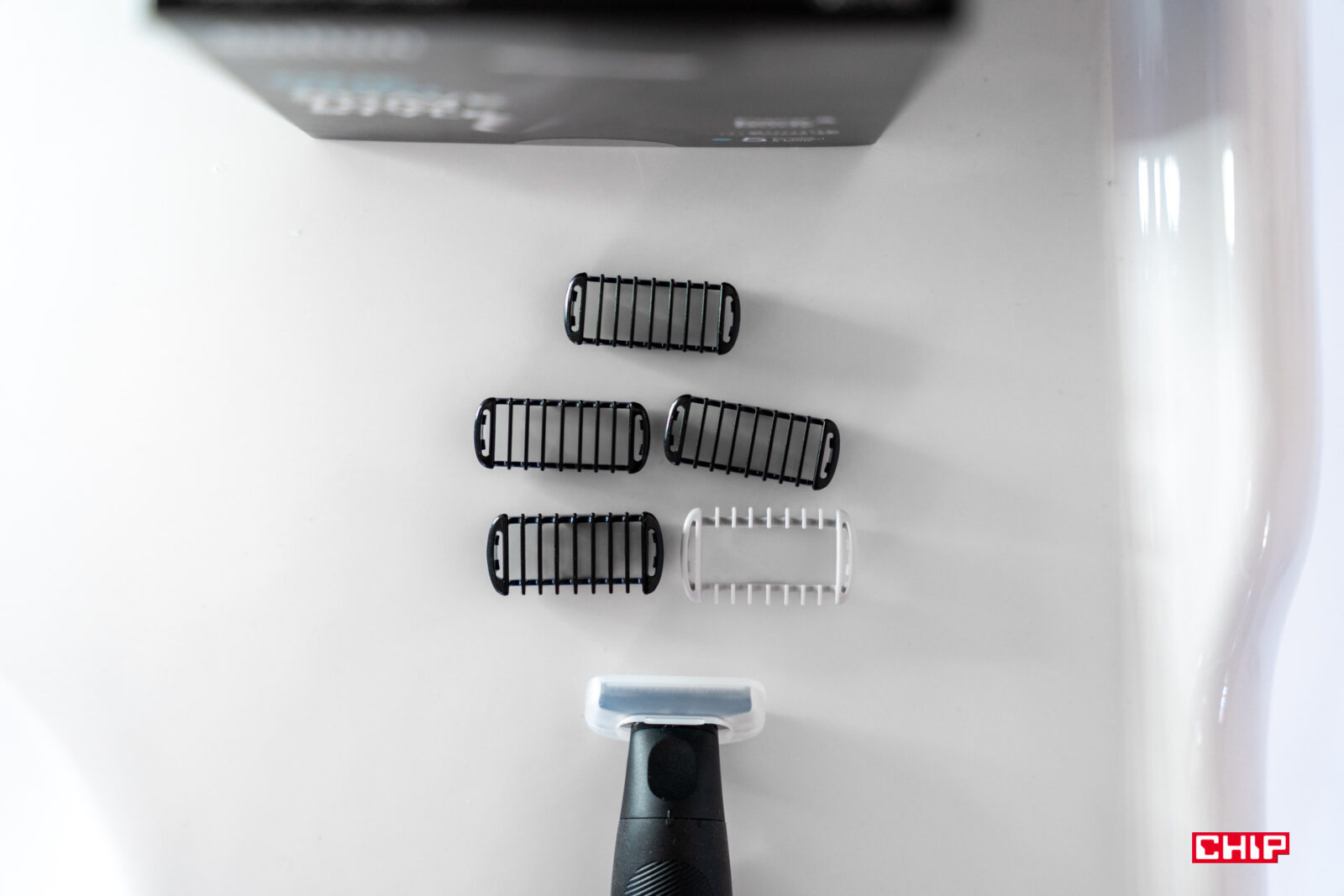 W zestawie znajdziemy pięć nakładek, do przycinania zarostu do różnej długości oraz nakładkę do golenia ciała. Urządzenie jest wodoodporne, a więcej szczegółów powiemy sobie podczas testu praktycznego.