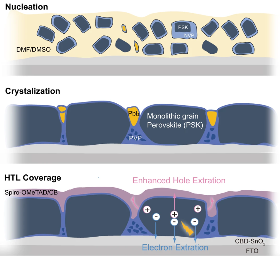 Najwięcej różnic w metodyce działania poczyniono podczas powlekania wirowego prekursorów perowskitów. Zastosowano tutaj kluczowy składnik: polimer N-winylo-2-pirolidonu (NVP). To dzięki niemu warstwa absorbująca tworzy charakterystyczny kształt, zwiększając powierzchnię graniczną z HTL.