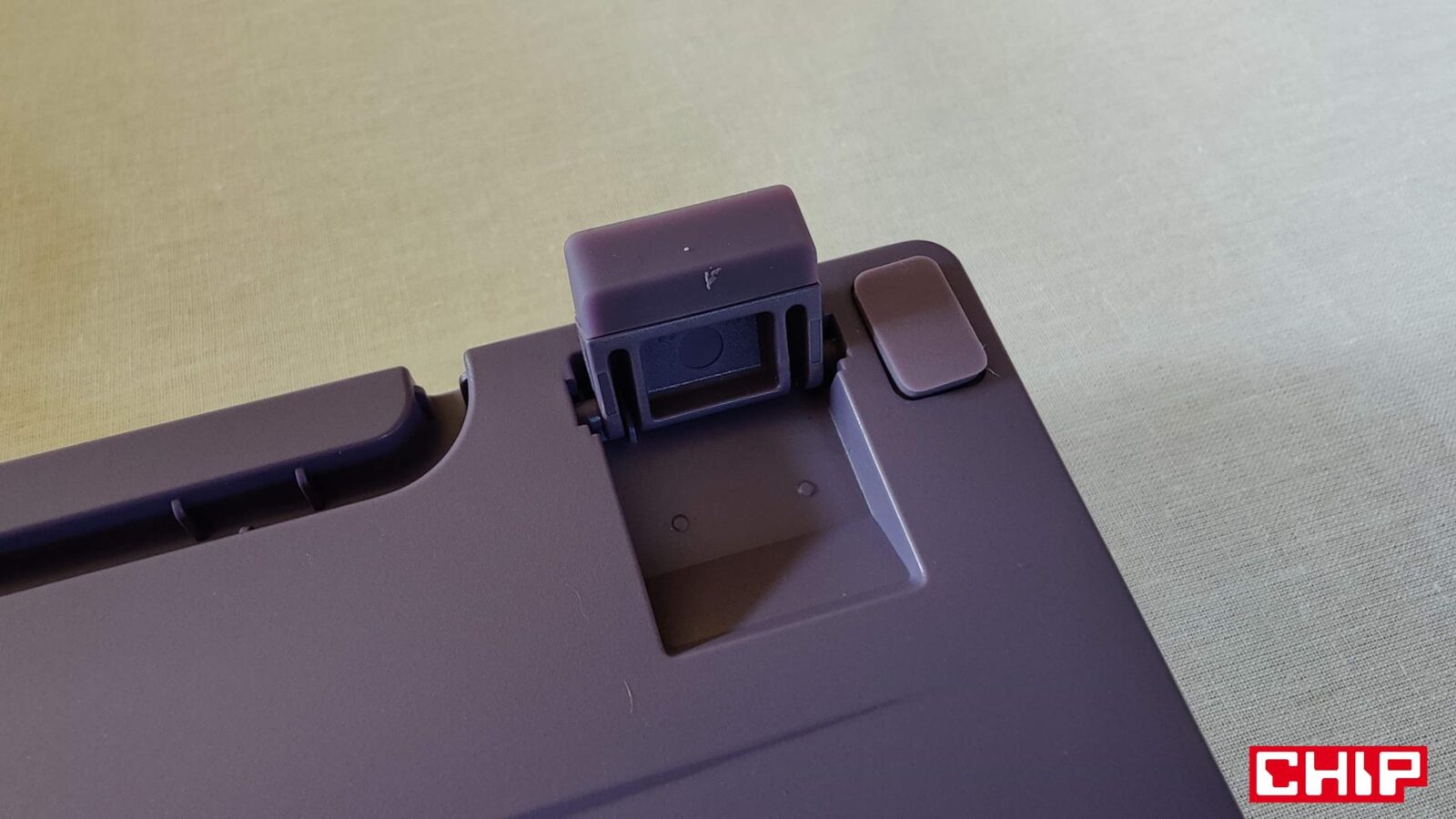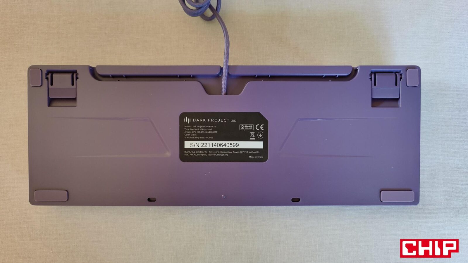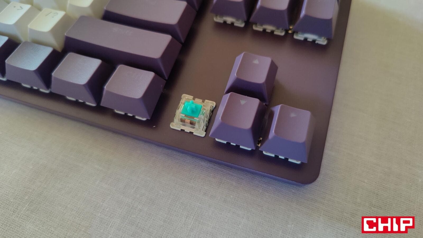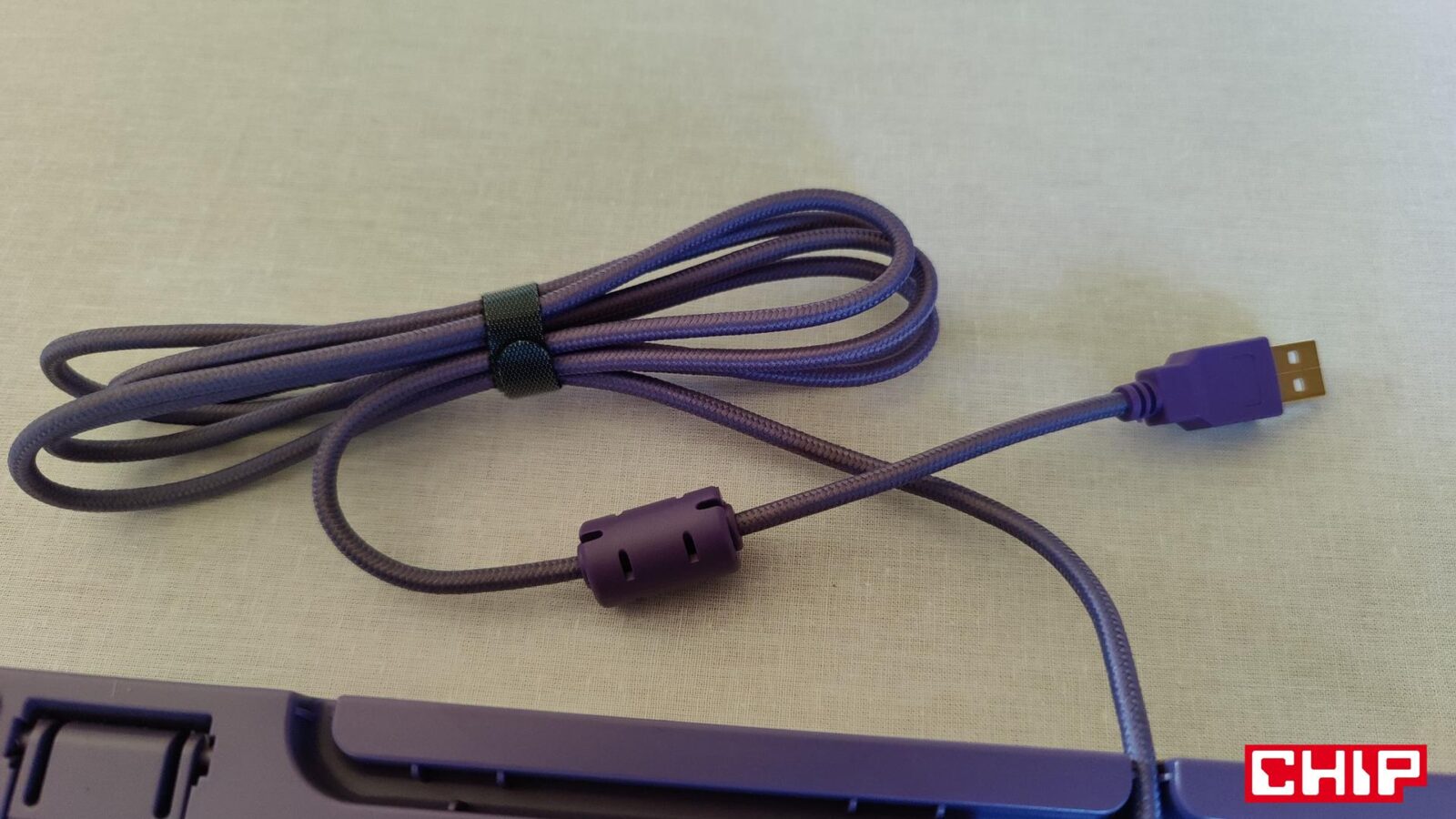 Nieco ciekawiej robi się na spodzie. Nie tylko ze względu na grube antypoślizgowe podkładki, ale też kanały do odprowadzania 180-mm przewodu w oplocie z jednej z trzech stron oraz parę nieleciwych nóżek z gumowym wyłożeniem. Im jednak bardziej przyjrzymy się temu modelowi, tym więcej ciekawych szczegółów dostrzeżemy, a dostrzegać jest co, bo pod białymi i fioletowymi klawiszami znajdują się nie tylko ciekawe przełączniki, ale też naoliwione stabilizatory (w przypadku dłuższych keycapów), będące domeną raczej bardziej zaawansowanych klawiatur.