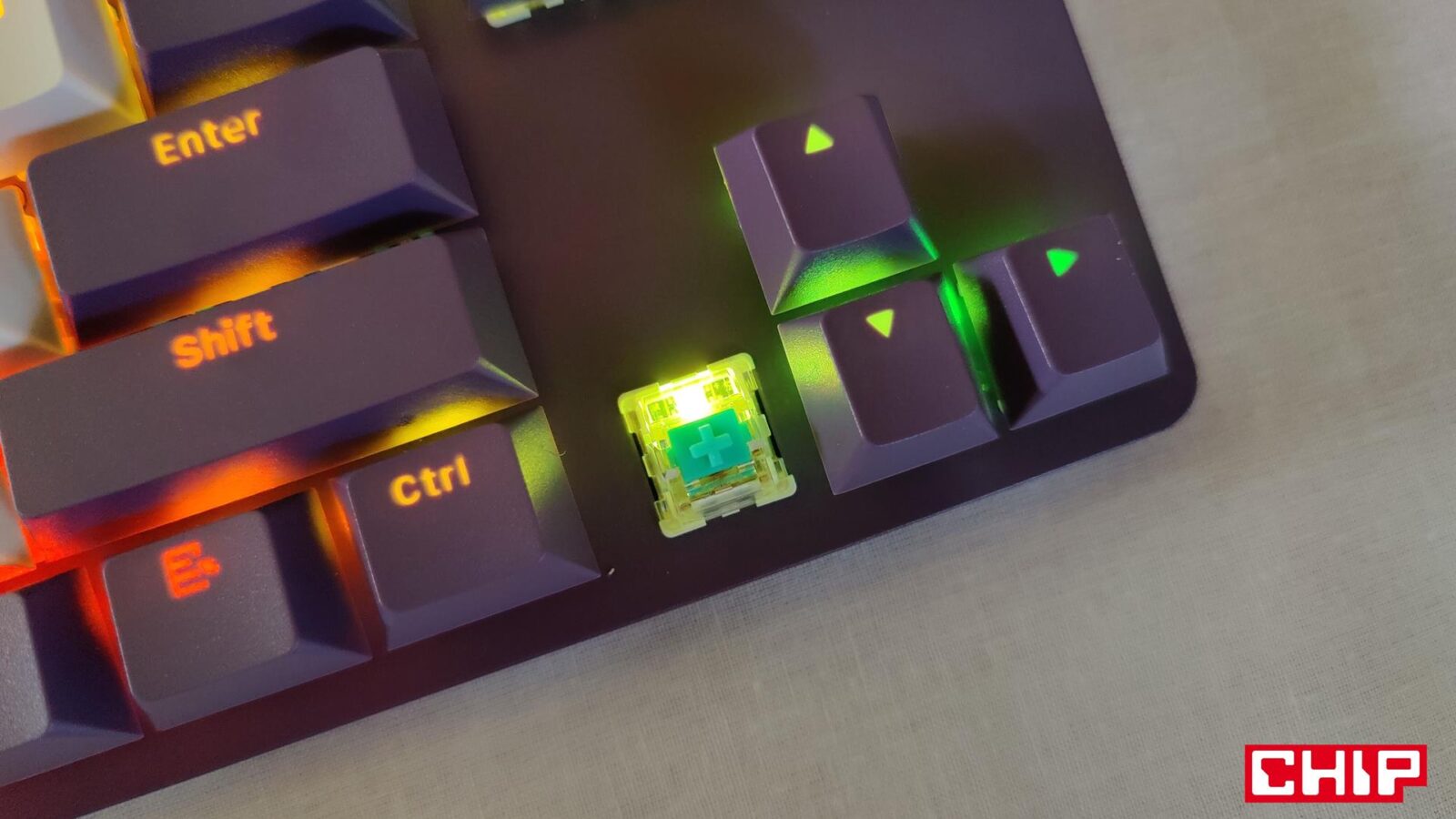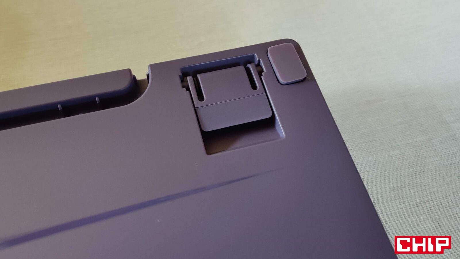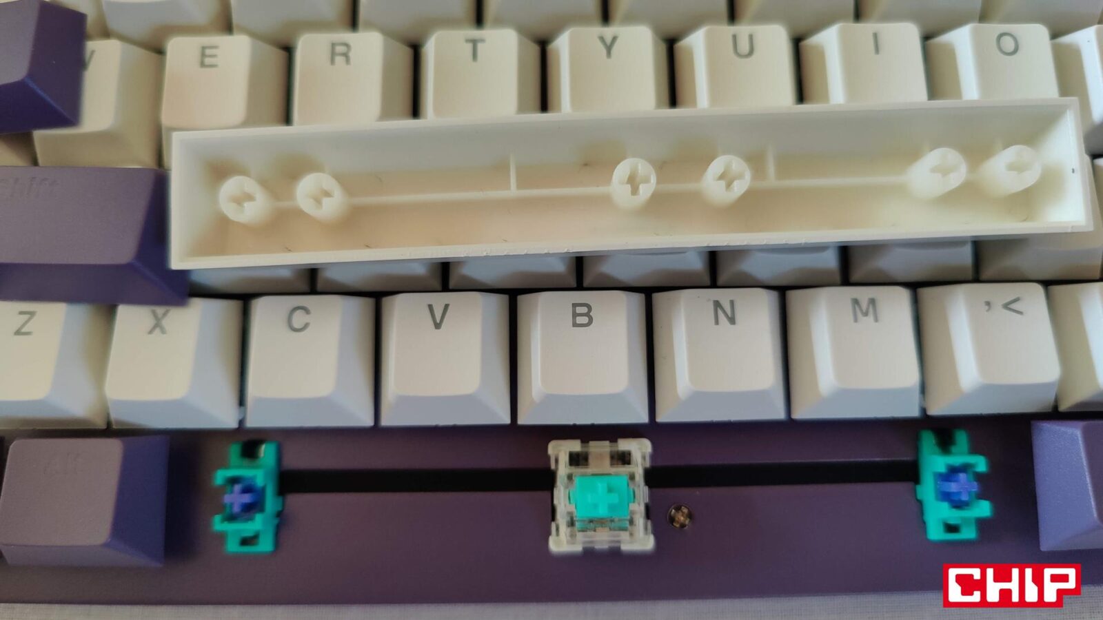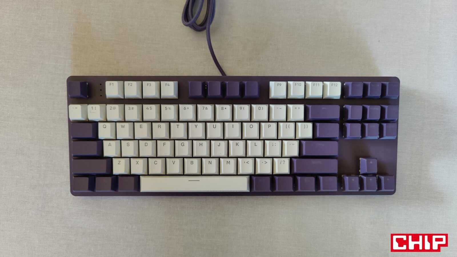Nieco ciekawiej robi się na spodzie. Nie tylko ze względu na grube antypoślizgowe podkładki, ale też kanały do odprowadzania 180-mm przewodu w oplocie z jednej z trzech stron oraz parę nieleciwych nóżek z gumowym wyłożeniem. Im jednak bardziej przyjrzymy się temu modelowi, tym więcej ciekawych szczegółów dostrzeżemy, a dostrzegać jest co, bo pod białymi i fioletowymi klawiszami znajdują się nie tylko ciekawe przełączniki, ale też naoliwione stabilizatory (w przypadku dłuższych keycapów), będące domeną raczej bardziej zaawansowanych klawiatur.