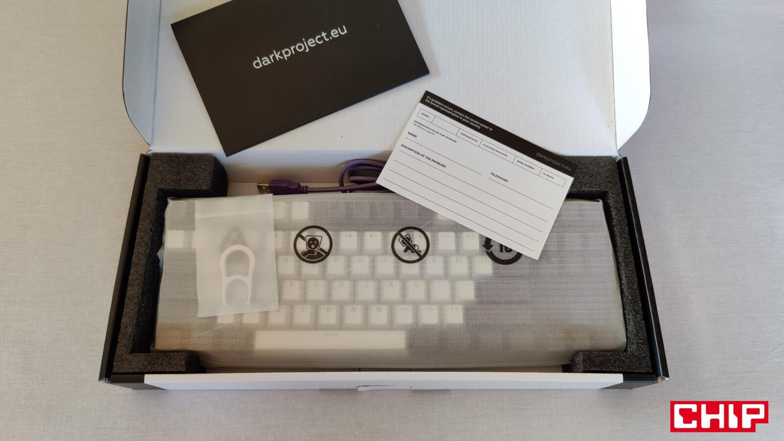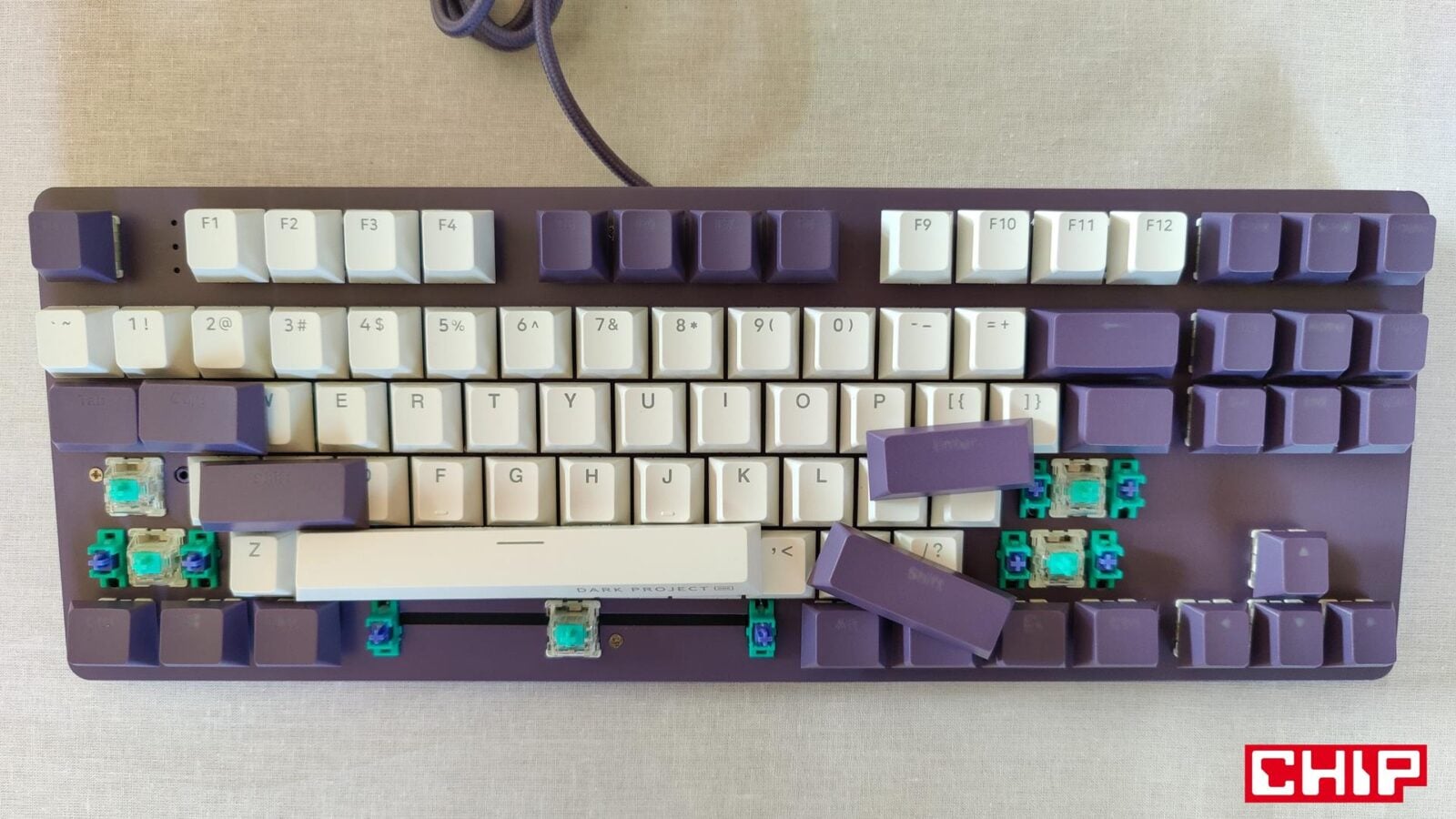 Ważąca 855 gramów One KD87A zaskakuje w obu tych szczegółach, choć Dark Project postawił jednocześnie na doskonale nam znaną formę TKL (rozmiar 357 x 130 x 23 mm) i dwuczęściową, zwężaną ku dołowi obudowę z tworzywa sztucznego, w której to podstawa łączy się z całkowicie płaskim górnym panelem. Oklepane od lat podejście może zaskoczyć wyłącznie łatwym dostępem do wnętrza obudowy (wystarczy odkręcić kilka śrubek wokół przełączników) oraz umiejscowieniem diod funkcyjnych między klawiszem ESC a F1.