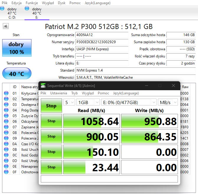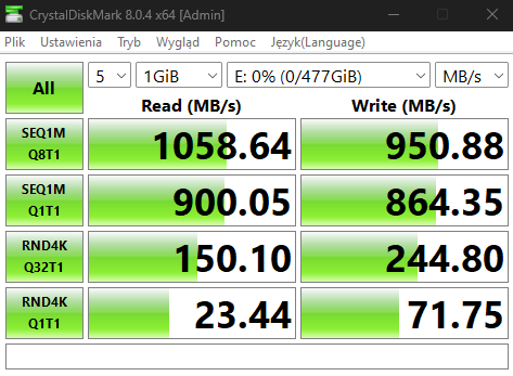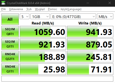 Wróćmy jednak może do tego, co najważniejsze, a więc tego, co więc tak naprawdę możecie oczekiwać od dysku Patriot P300 w obudowie TUF Gaming A1. Na papierze dysk ten oferuje 1700 MB/s prędkości sekwencyjnego odczyt i 1100 MB/s sekwencyjnego zapisu. Po podpięciu do komputera poprzez dołączony przewód USB możecie liczyć na około 1050 MB/s odczytu i 950 MB/s odczytu przy niezapełnionym nośniku, co potwierdza poniższy test, ukazujący również wysoką wydajność systemchłodzenia.