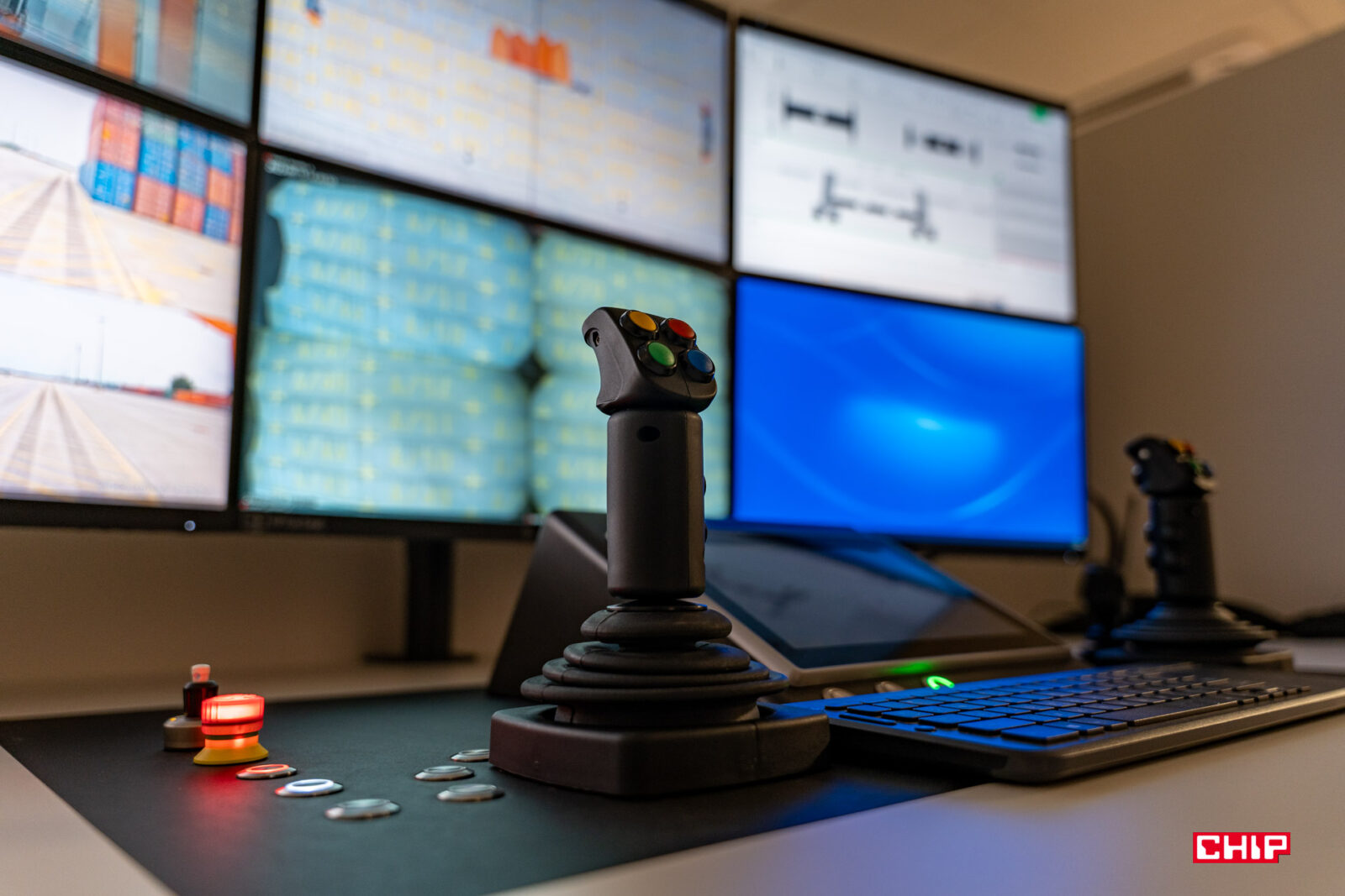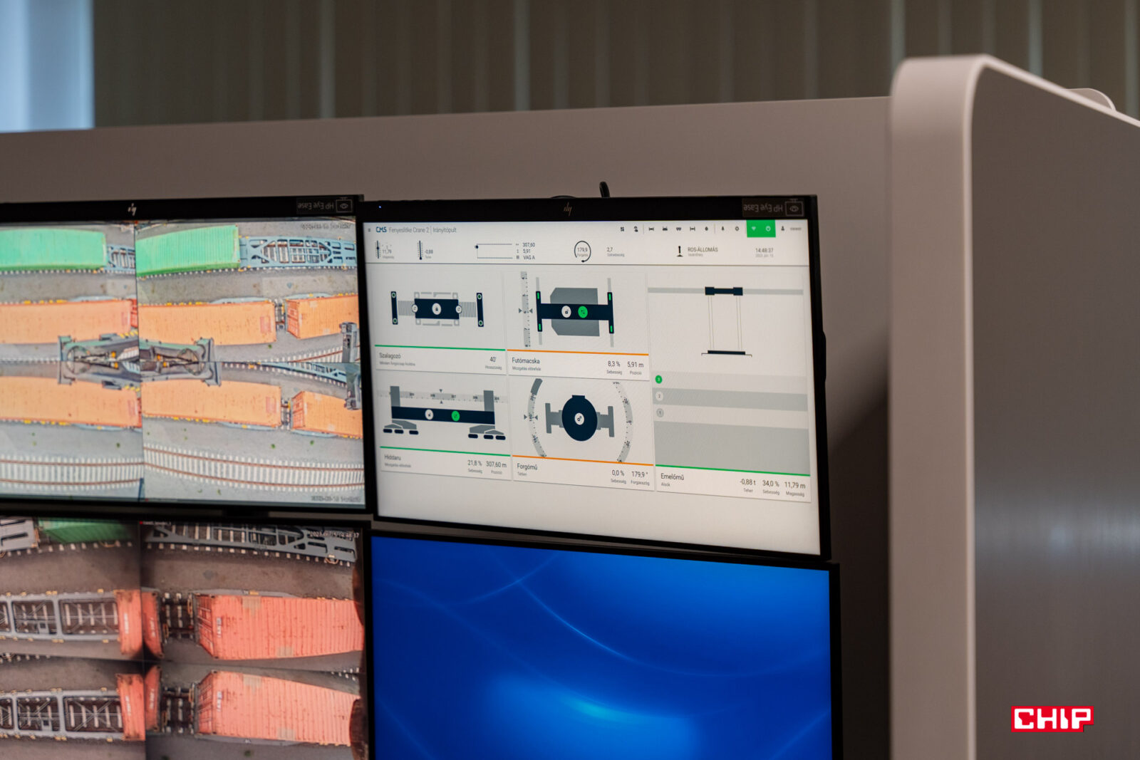 Drugą grupą pracujących tu osób są operatorzy dźwigów. Na zdjęciach możecie zobaczyć ich stanowiska. Na zmianie pracują zawsze cztery osoby i co ciekawe, ich szefem jest najstarsza osoba w zespole. Ma… 29 lat(!). Operatorzy za pomocą dżojstików i obrazu z kamer zajmują się rozładunkiem pociągów. Na każdym z dźwigów są co najmniej 24 kamery, a niskie opóźnienie pozwala na bardzo płynne sterowanie.
