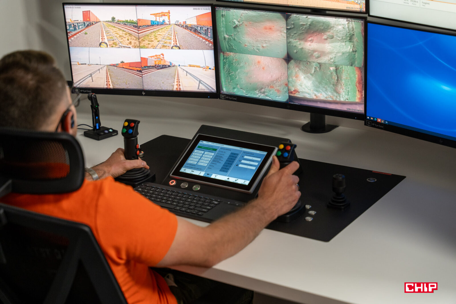 To teraz – po co to całe 5G? Z sieci korzystają dwa pracujące tu zespoły – operatorzy dźwigów oraz ochrona i logistyka. Zacznijmy od tego drugiego, bo to oni są odpowiedzialni za rozpoczęcie prac z towarem. W sposób całkowicie zdalny sterują torami. Wpuszczają pociągi na teren terminala, które zaraz po wjeździe są dokładnie skanowane. Jest tworzony ich model 3D i robione są dokładne zdjęcia i nagrania. Zapisywane są numery wagonów, oznaczenia (np. towarów niebezpiecznych) i ich stan. Na wypadek, gdyby trzeba było udowodnić, że ewentualne uszkodzenia nie powstały w wyniku przeładunku na terminalu. Tutaj też odbywa się cała logistyka. Trafiają tu informacje o tym, jakie pociągi i kiedy przyjadą czy jaki przywiozą towar.