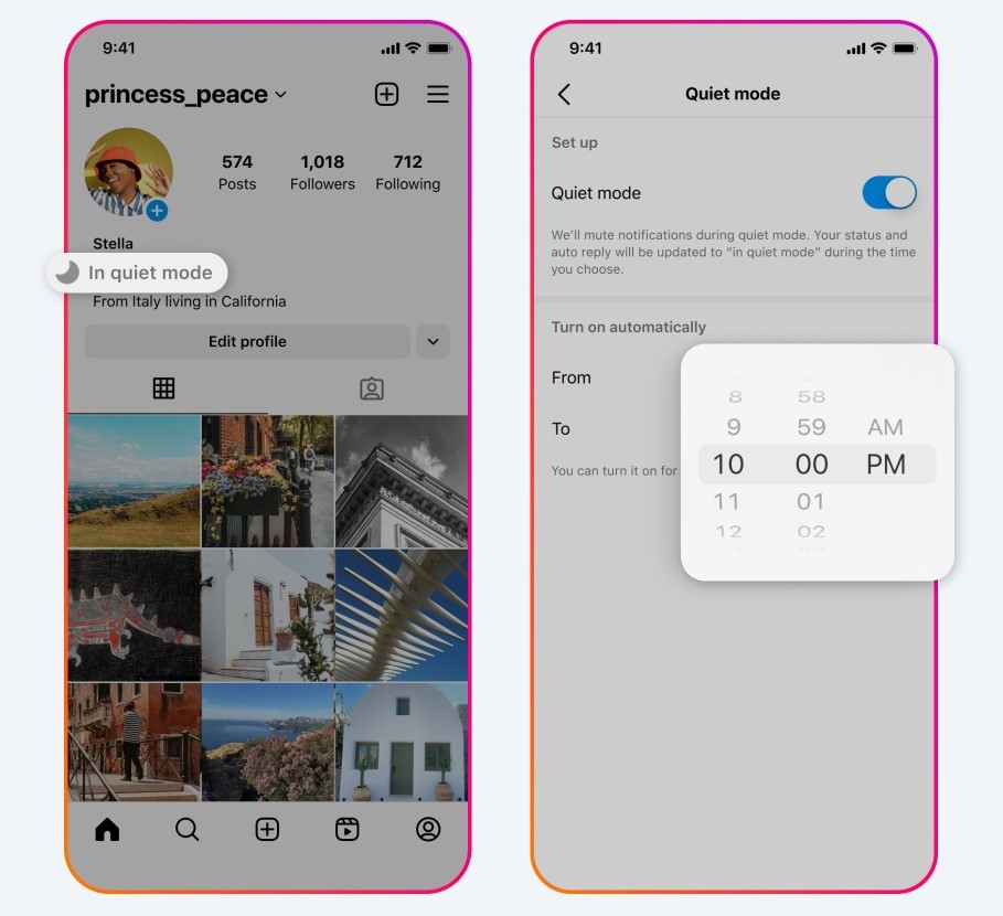 Meta, oprócz ogólnego bezpieczeństwa i prywatności, chce również promować zdrowe nawyki cyfrowe na Instagramie i Facebooku. W tym celu rozszerza dostępność trybu cichego na Instagramie na cały świat – jest to opcja pozwalająca na wstrzymanie powiadomień i ustawienie automatycznych odpowiedzi, które w tym czasie będą wysyłane do osób, które chcą się z użytkownikiem skontaktować. Natomiast na Facebooku pojawiać się będą powiadomienia zachęcające do zrobienia przerwy czy zamknięcia aplikacji w nocy – te wyświetlane będą po 20 minutach ciągłego użytkowania.