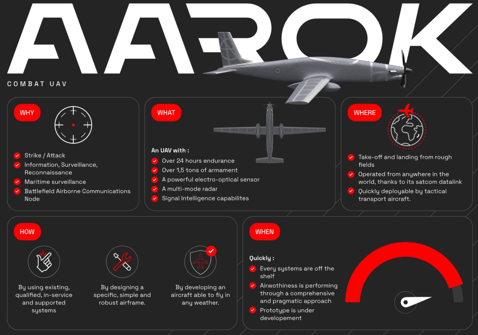 Bezzałogowiec Aarok został opracowany przez francuskiego wykonawcę obronnego Turgis & Gaillard i wedle wszystkich znaków w prasówkach i zapowiedziach, ma zrewolucjonizować rynek dronów o średnim pułapie lotu i dużej wytrzymałości, czyli klasę MALE. Odpowiadający za niego projektanci postanowili skupić się na wszechstronności, wytrzymałości oraz ogólnie wysokiej wydajności tego drona, którego rozpiętość skrzydeł wynosi prawie 22 metry, a maksymalna masa startowa sięga 5400 kilogramom, z czego waga użytecznego ładunku nie może przekroczyć nieco ponad 2720 kilogramów, a uzbrojenia poziomu 1500 kg. To dużo. Tak dużo, że Aarok może zabierać na misję różnorodny sprzęt bojowy w zależności od tego, czego akurat się od niego oczekuje.