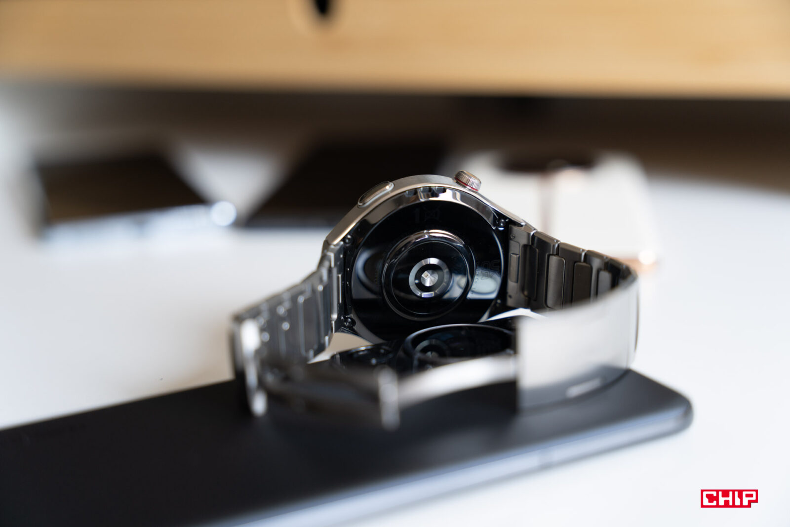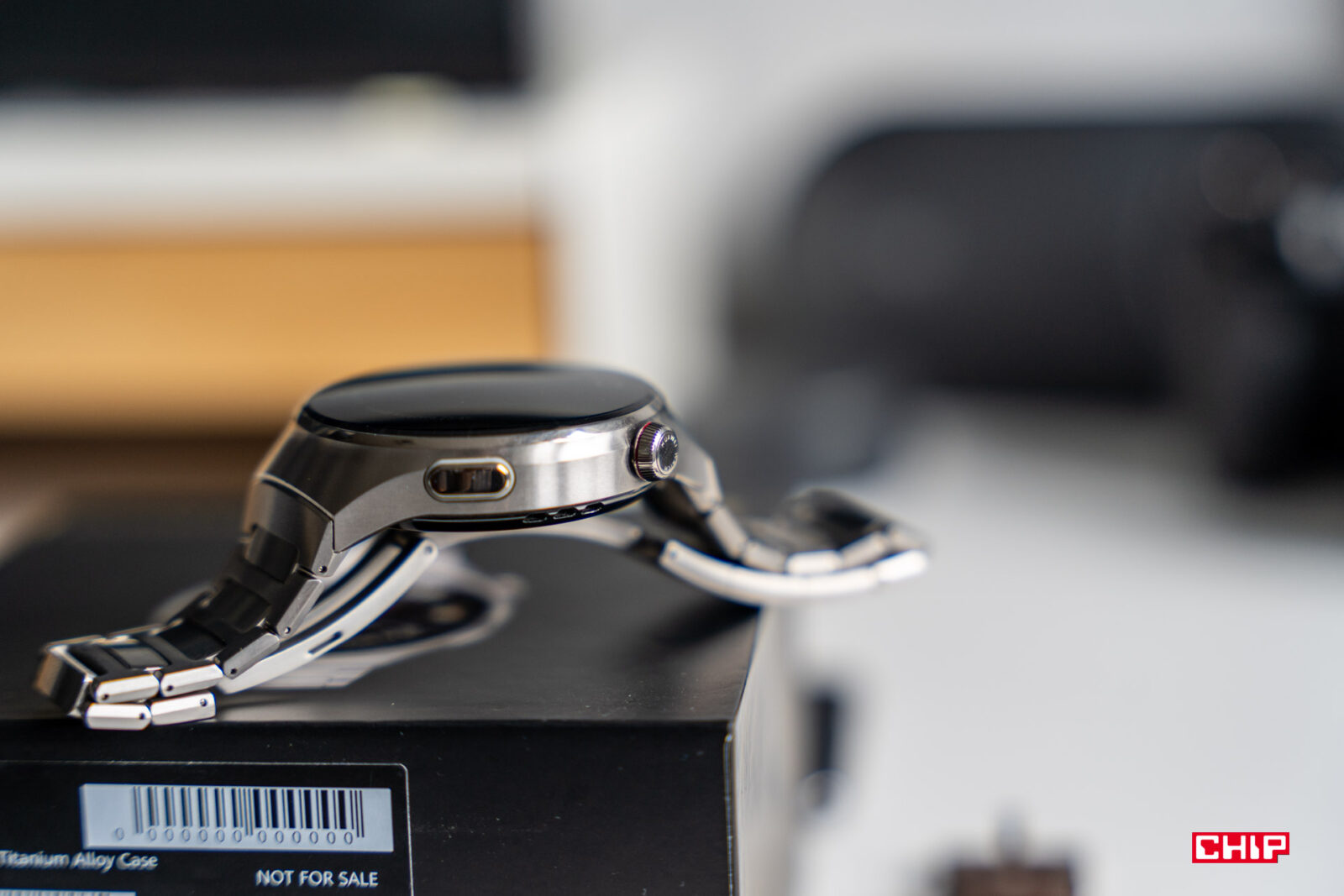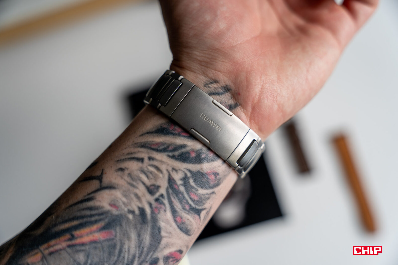 Zegarek z bransoletą kojarzy się z czymś ciężkim. Biorąc do ręki Watch 4 Pro można się nieźle zdziwić, bo konstrukcja jest zaskakująco lekka. Można odnieść wrażenie, że trzymamy samą obudowę bransolety, która jest pusta w środku. Ale jednocześnie ani trochę nie odejmuje jej to solidności. Huawei przekonuje, że to zasługa zastosowanego tutaj stopu tytanu.
