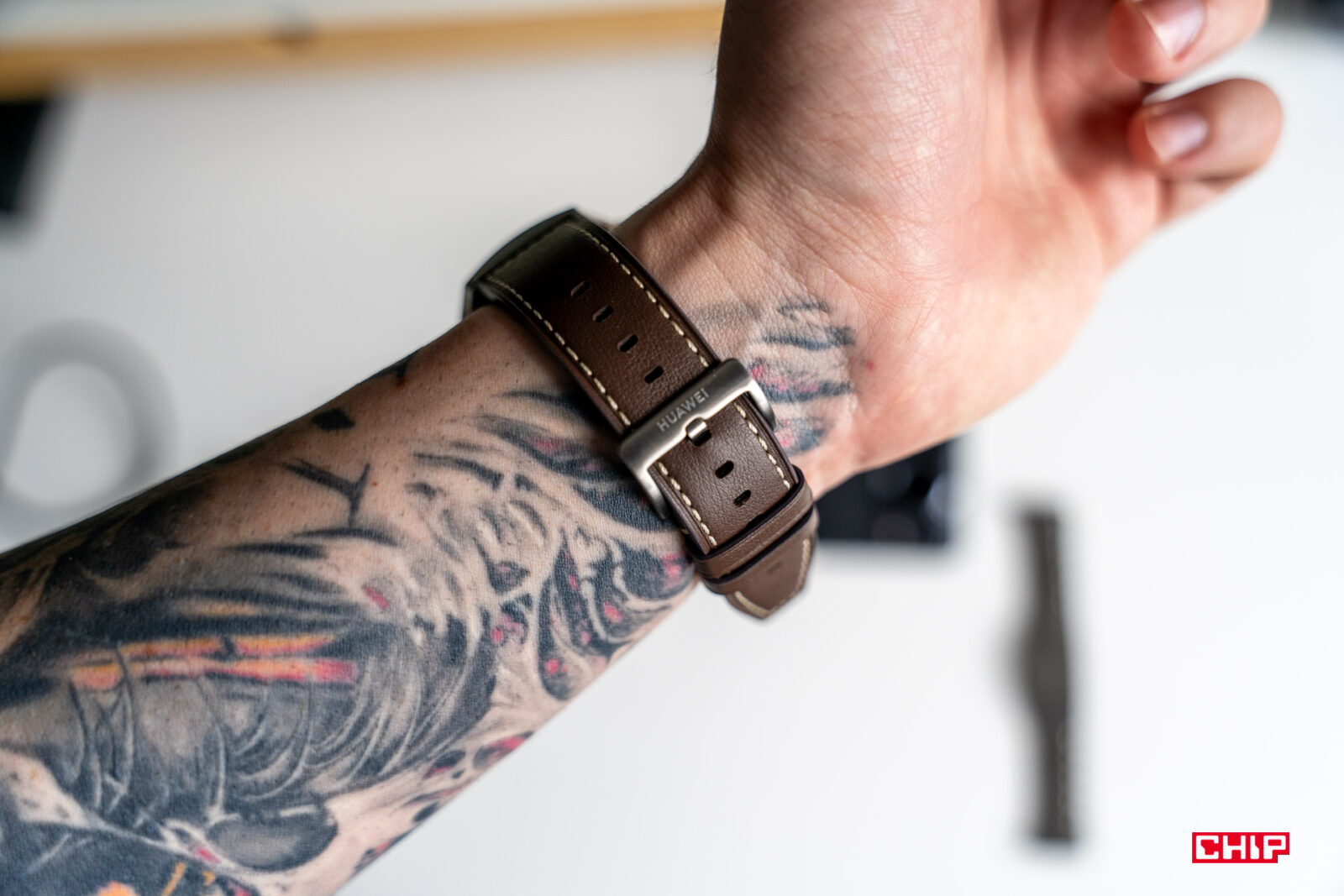 Decydując się na Watcha 4 w wariancie Pro mamy do wyboru wersję elegancką z bransoletą lub… elegancką ze skórzanym paskiem. Na zdjęciach widzicie jeden i drugi wariant. Jeśli potrzebujecie paska sportowego trzeba go dokupić osobno i obecnie w promocji jest to koszt 69 zł. Traf chciał, że okres testów zegarka był u mnie dosyć aktywny i zazwyczaj ani skóra, ani bransoleta mi nie pasowały. Dlatego też przez ładny kawałek czasu używałem zegarka Huawei Watch 4 Pro Fossil Edition, który wyglądał tak:
