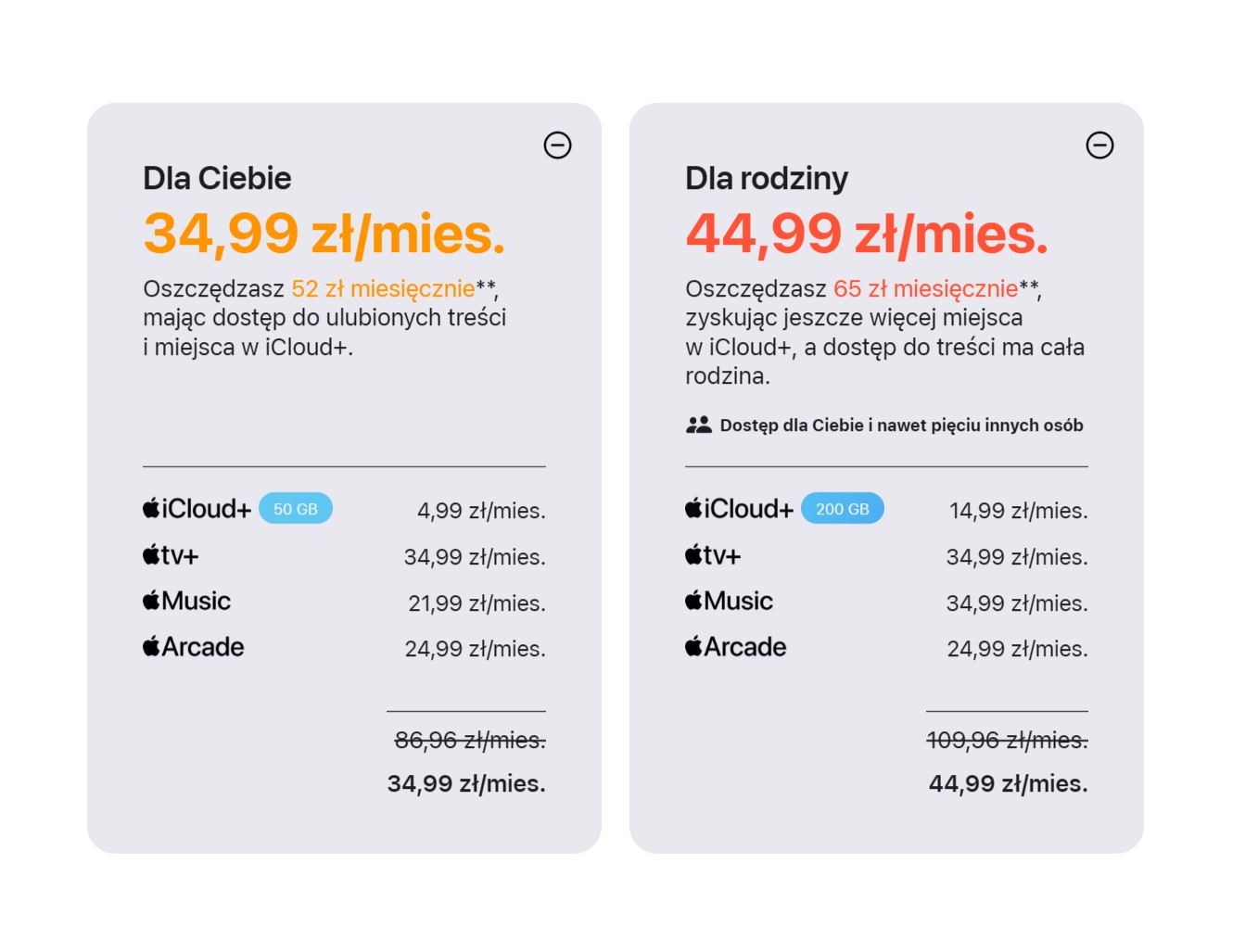 Co ciekawe, nie zmieniły się ceny za pakiet Apple One, zawierający Apple Arcade, Apple TV+, Apple Music oraz iCloud+. I tak wariant indywidualny usługi z pakietem iCloud+ 50 GB kosztuje wciąż 34,99 zł, a rodzinny, w którym znajduje się iCloud+ 200 GB, 44,99 zł. Prawdopodobnie ceny pozostały bez zmian, bo Apple podniósł je zaledwie w październiku ubiegłego roku.