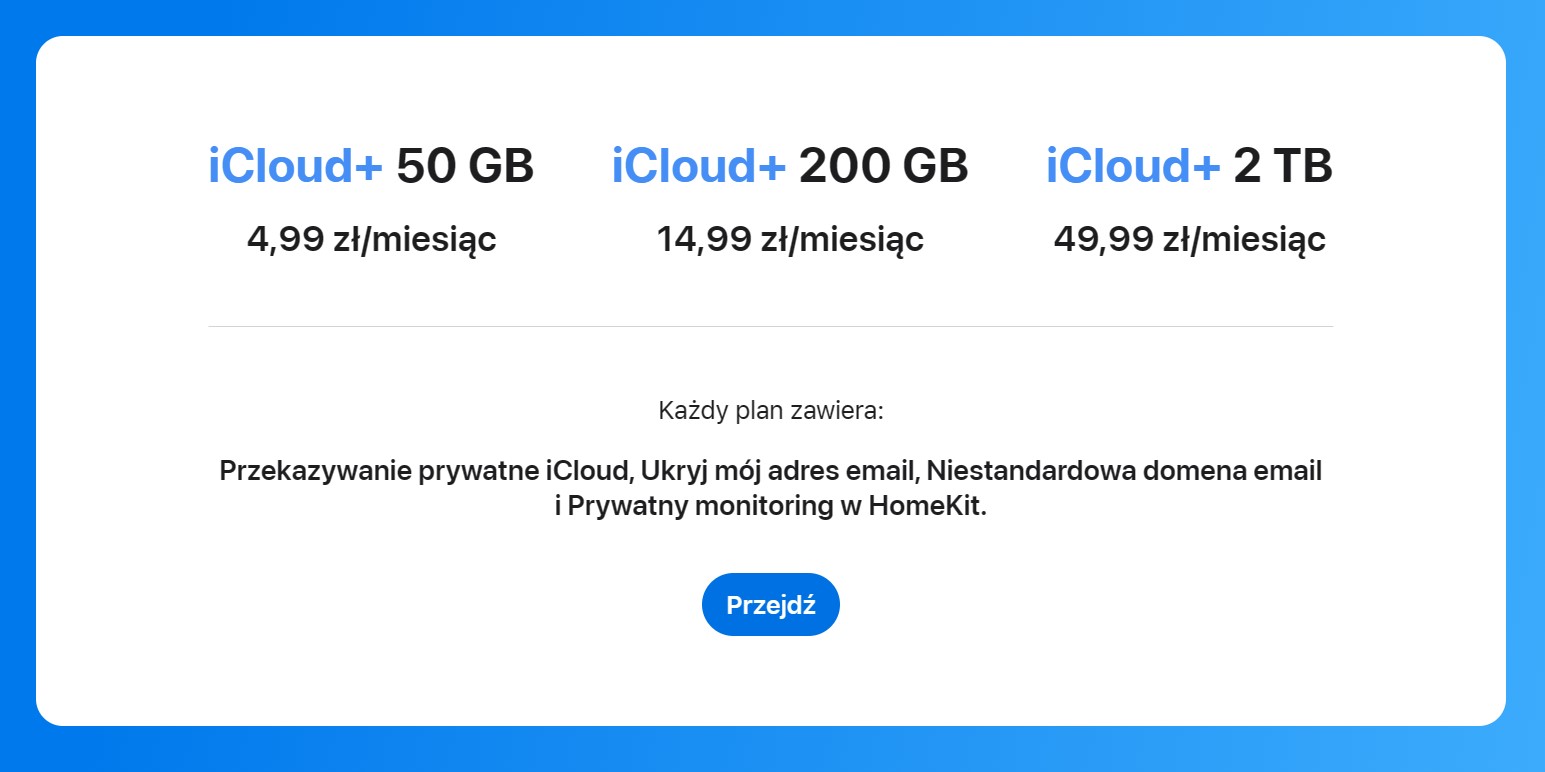 - iCloud+ 50 GB – 4,99 zł (zmiana z 3,99 zł)