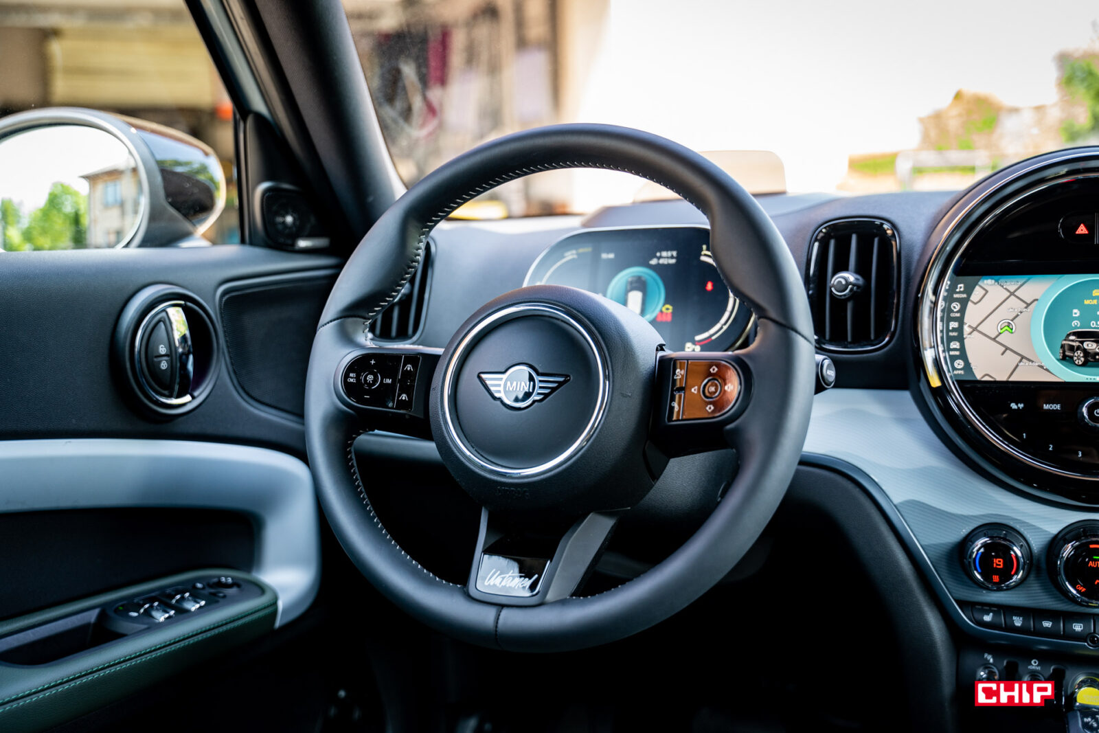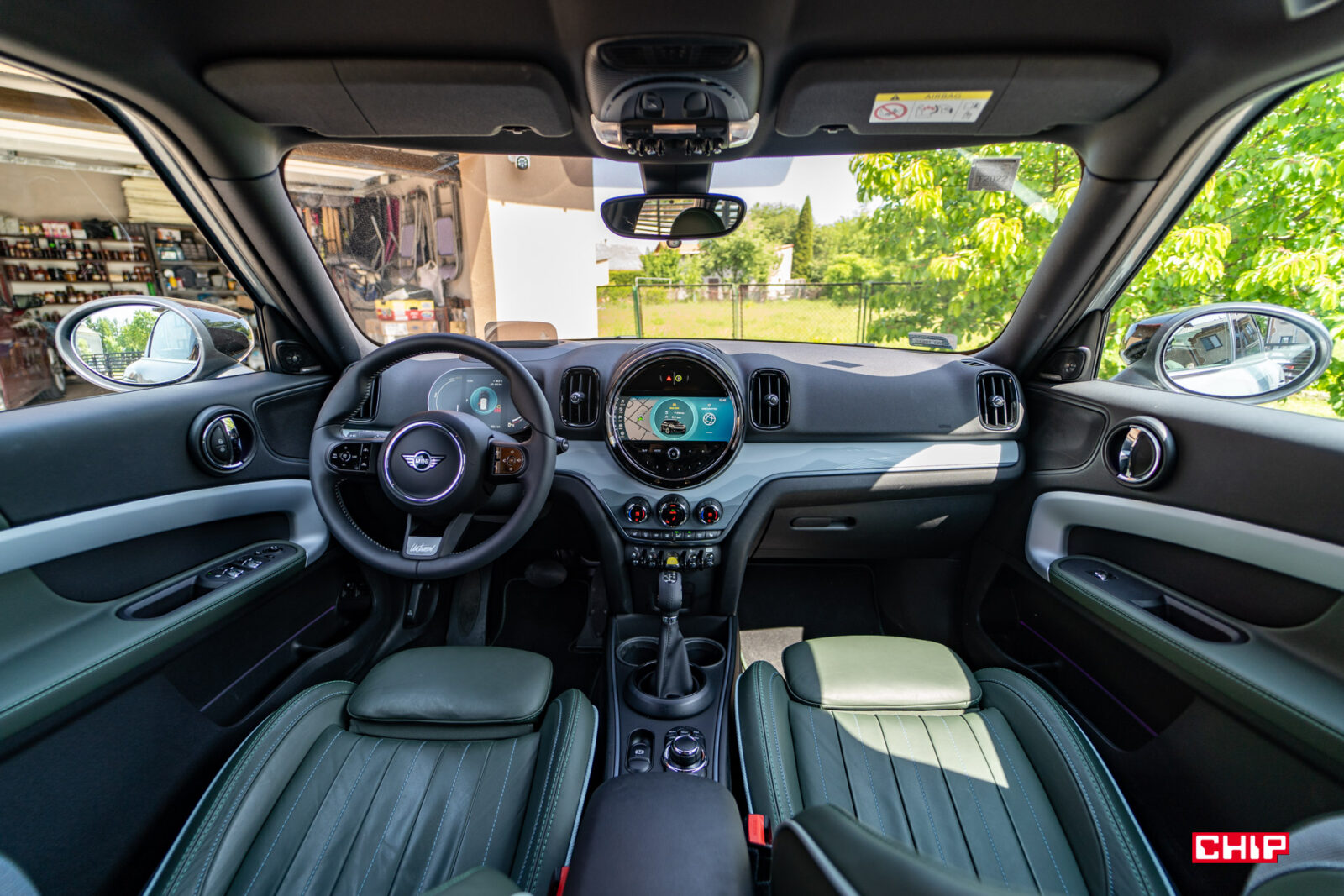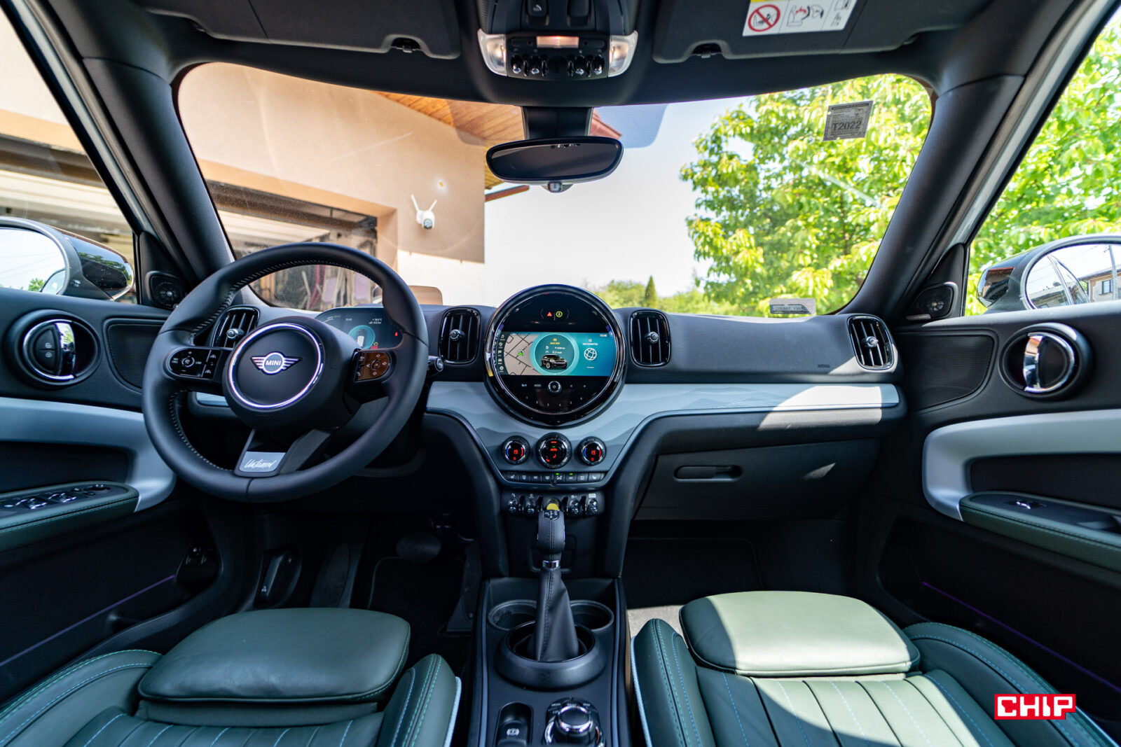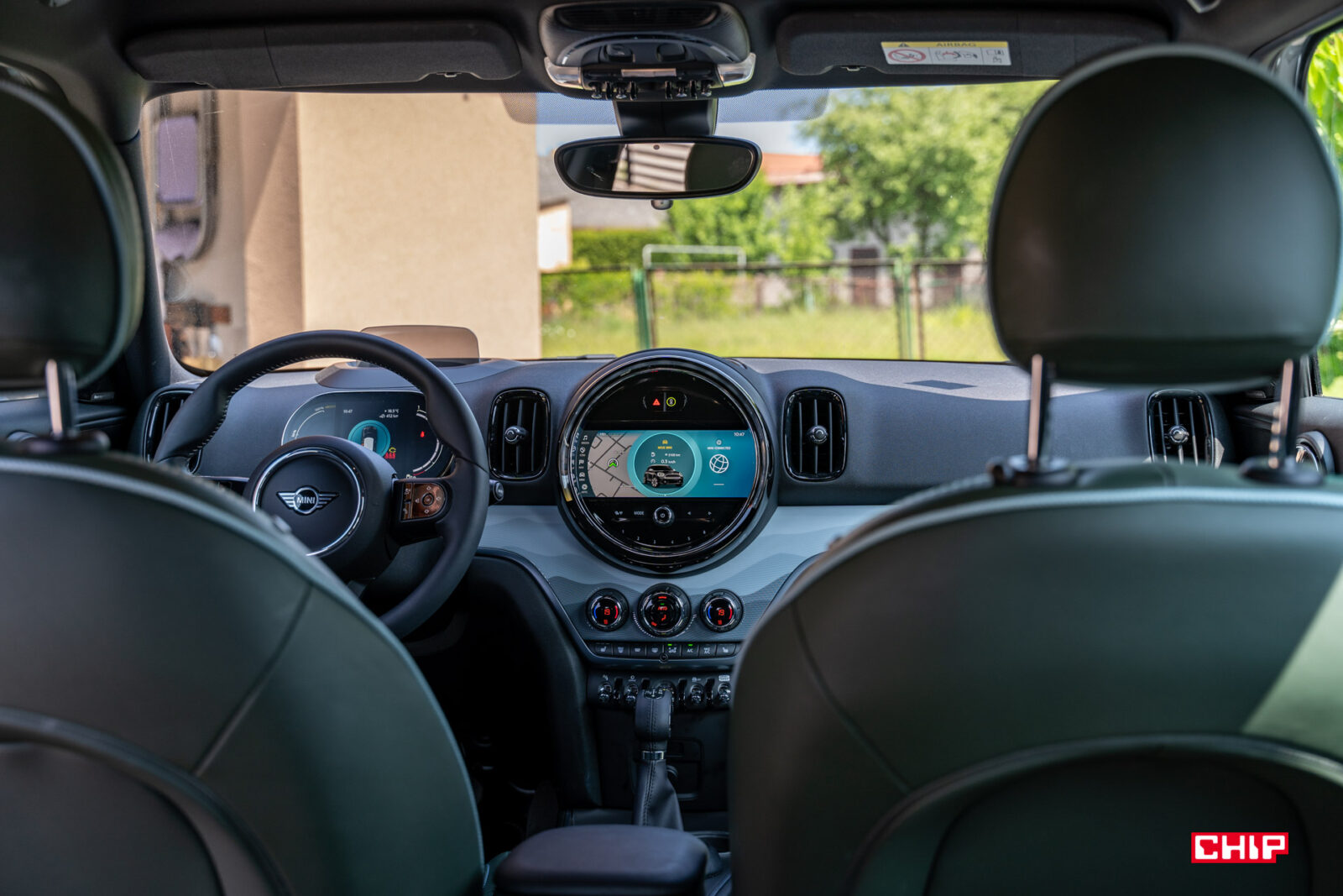 We wnętrzu Mini Countrymana dominują, typowe dla mini, okrągła akcenty. Tak, kółka są dosłownie wszędzie, ale ma to swój urok. Szczególnie w połączeniu z samolotowymi przełącznikami. Wnętrze jest też dyskretnie podświetlane, a kolor podświetlenia można zmieniać ręcznie lub zdać się na automat dopasowany do wybranego trybu jazdy.