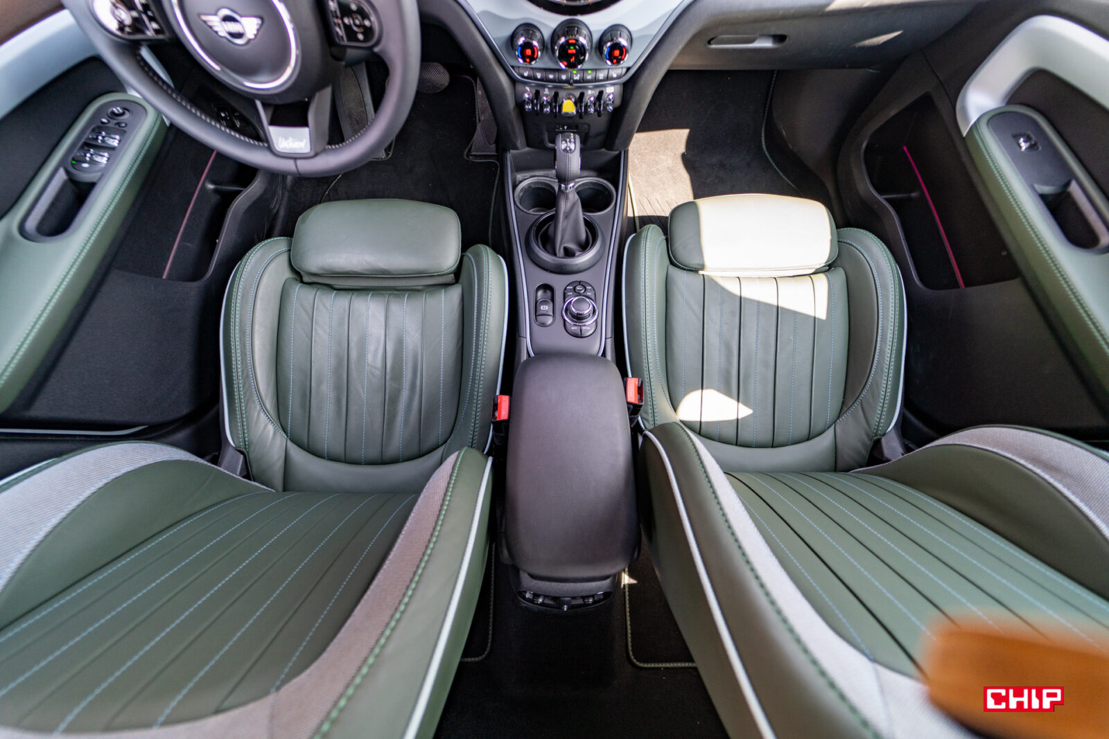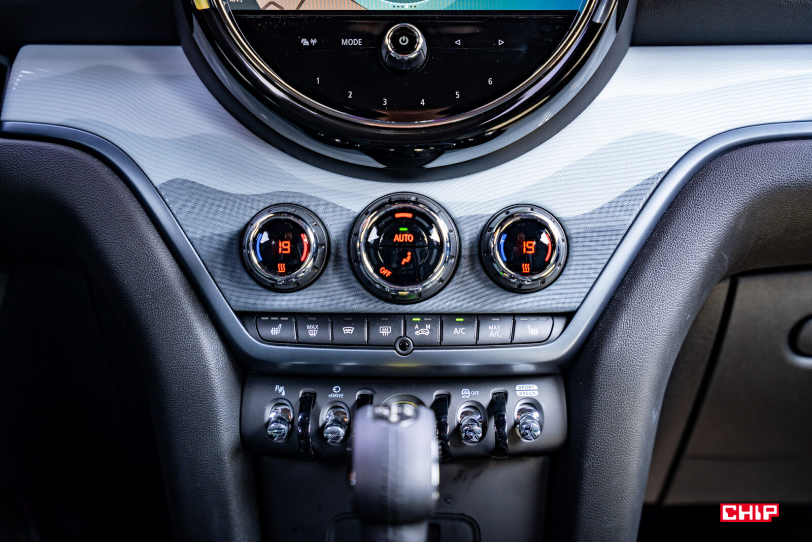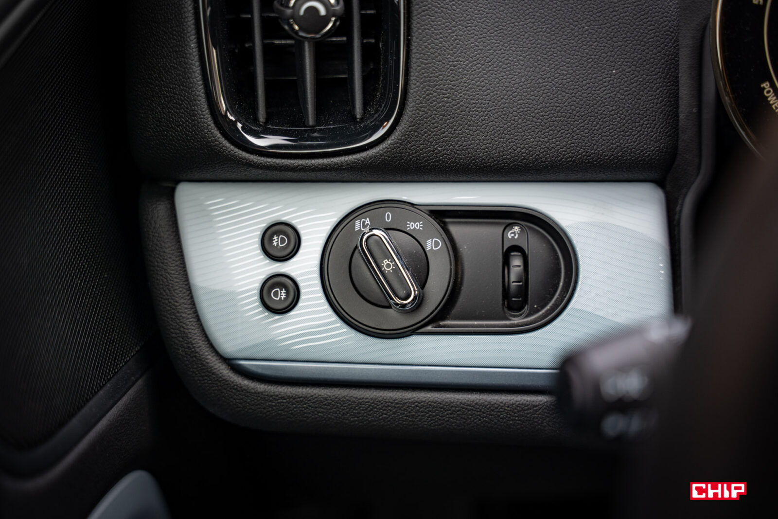 We wnętrzu Mini Countrymana dominują, typowe dla mini, okrągła akcenty. Tak, kółka są dosłownie wszędzie, ale ma to swój urok. Szczególnie w połączeniu z samolotowymi przełącznikami. Wnętrze jest też dyskretnie podświetlane, a kolor podświetlenia można zmieniać ręcznie lub zdać się na automat dopasowany do wybranego trybu jazdy.