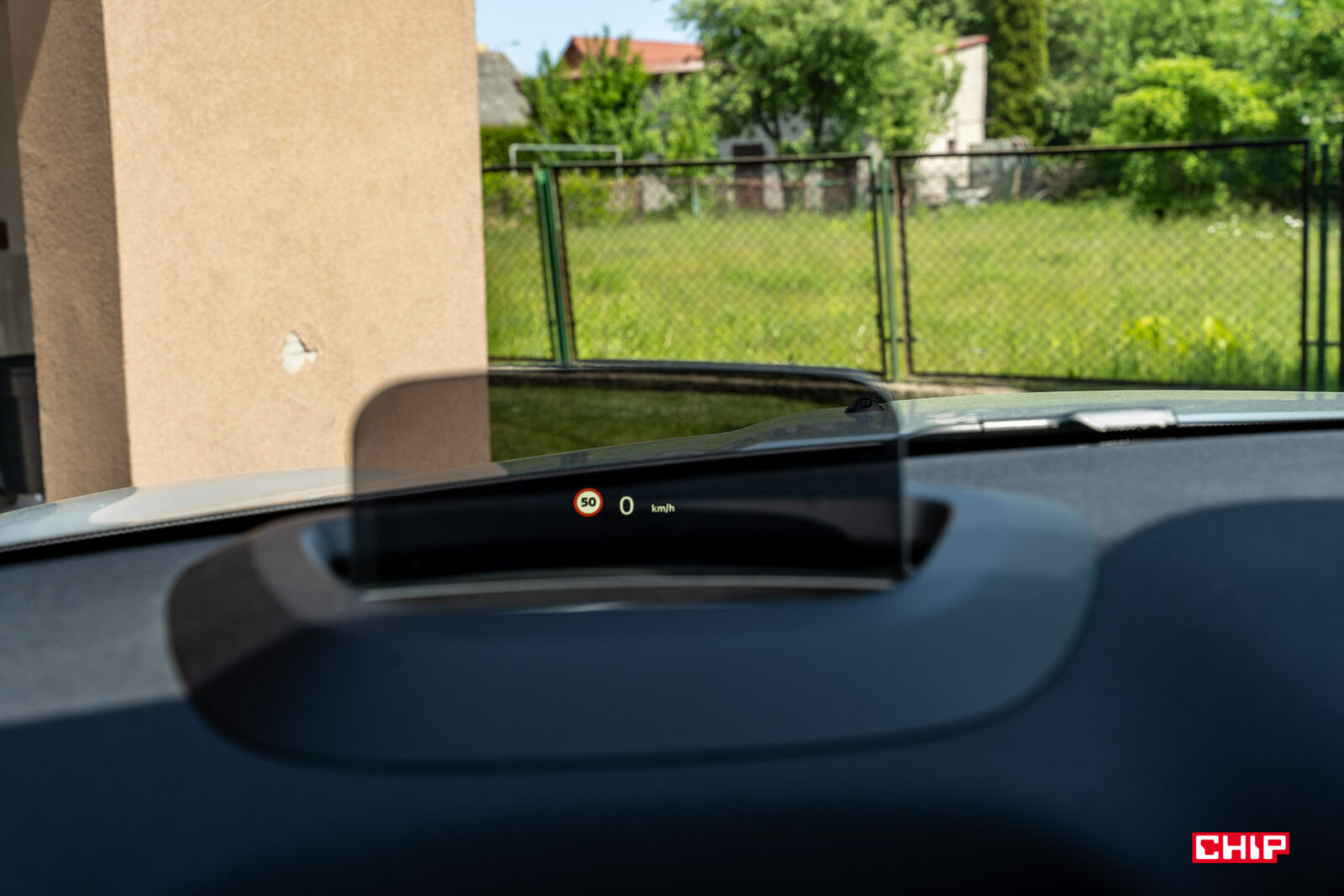 Ekran kierowcy jest bardzo ciekawy, bo tak naprawdę faktyczny ekran znajduje się tylko na środku. Po bokach mamy diodowe wskaźniki, bardzo efektownie podświetlane i prezentuje się bardzo efektownie, ale też jest użyteczne. Wskaźniki są czytelne w dzień i w nocy, a matowa powłoka skutecznie blokuje wszelkie odblaski. Nad nim znajdziemy head-up w formie prostej, unoszonej szybki.