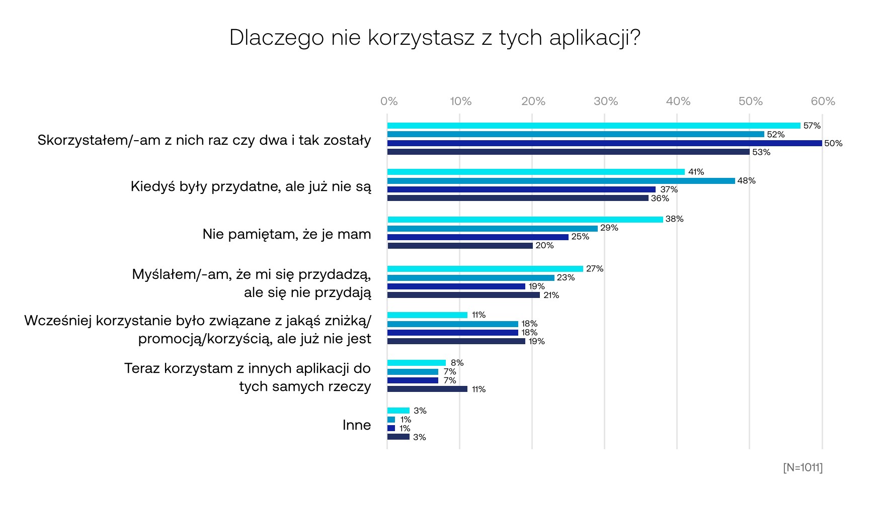 O ile zachęta do korzystania z aplikacji nie jest taka łatwa, to jak się okazuje, bardzo łatwo do aplikacji zniechęcić. Największy wpływ mają tu problemy techniczne 52% w grupie najmłodszych użytkowników) i zbyt nachalna promocja aplikacji (38% w tej samej grupie). W efekcie aplikacje często są „porzucane” – czyli są zainstalowane, ale nie są wykorzystywane. Blisko połowa badanych ma od 1 do 5 takich aplikacji, a 1/4 od 5 do 10 programów leżących odłogiem.