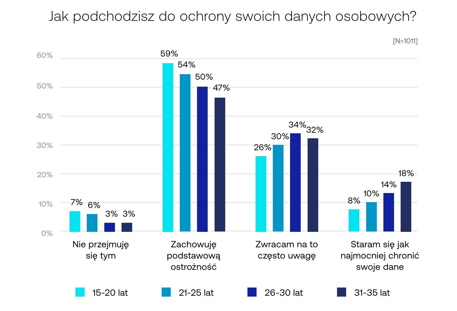 Za intensywnością użytkowania nie idzie jednak ostrożność. W grupie wiekowej 15-20 lat 59% ankietowanych zachowuje jedynie podstawową ostrożność w udostępnianiu swoich danych osobowych, a aż 7% nie przykłada do tego najmniejszej wagi. Jedynie 8% stara się chronić swoje dane w maksymalnym stopniu, a 26% zwraca większą uwagę na ochronę danych.