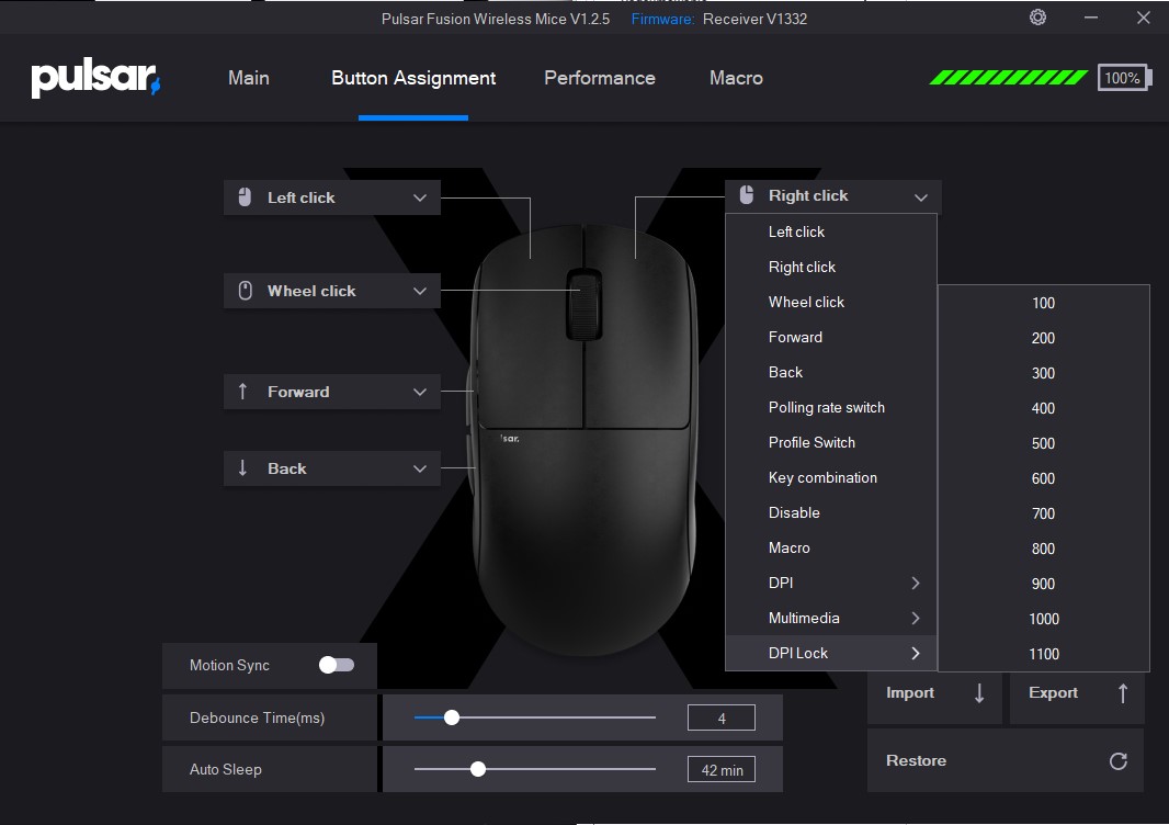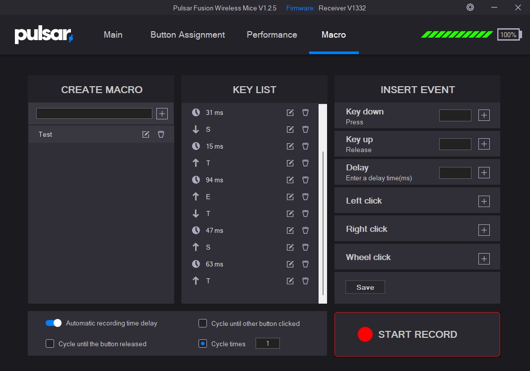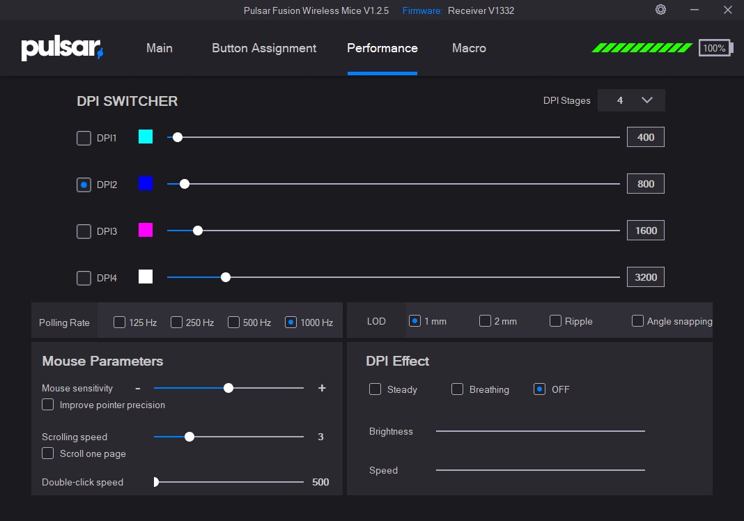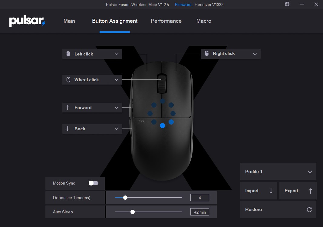 Zamiast spartańskiego wręcz zestawu funkcji, Pulsar postarał się nie tylko o tradycyjną podstawę (kreator makr, możliwość podmiany funkcji klawiszy, dostosowywanie poziomu częstotliwości odświeżania oraz czułości wedle czterech poziomów CPI), ale też bardziej imponujące dodatki pokroju możliwości ustawienia czasu, po upłynięciu którego mysz przechodzi do trybu uśpienia czy nawet efektu diody (włącznie z kolorem), która aktywuje się po zmianie poziomu CPI. Domyślnie jest ona wyłączona.