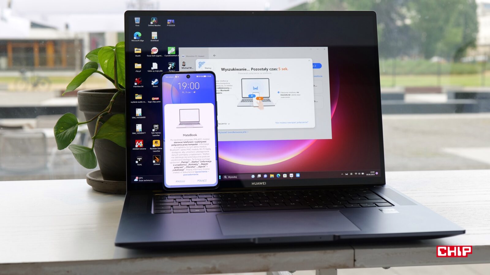 Huawei laptopem MateBook dopełnia swój ekosystem i przewidział sporo funkcjonalności dla tych, którzy posiadają smartfon czy akcesoria z jego portfolio. W laptopie znajdziemy Menedżer PC Huawei, z poziomu którego połączymy się ze smartfonem Huawei albo tabletami bądź monitorem MateView. Połączenie ze smartfonem (po zalogowaniu się w ramach jednego konta Huawei ID) daje nam szybki dostęp do całej zawartości urządzenia, a nawet do opcji pracy na nim z poziomu okna w laptopie. Nic nie stoi na przeszkodzie, by odebrać wiadomość lub połączenie na MateBooku 16s.