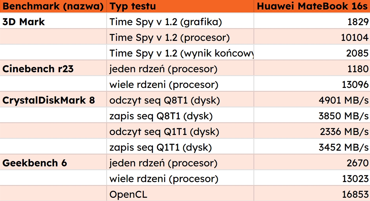 Huawei MateBook 16s jest jeszcze mocniejszy niż przed rokiem. Przy maksymalnym poborze mocy układu Intel i9-13900H wynoszącym 60W nie jest to jeszcze narzędzie do grania, ale z pewnością nie złapie zadyszki podczas wielozadaniowej pracy. Montowanie filmików na TikToka Focus Technologie (zapraszam) w 4K nie zmęczyło laptopa niezależnie od tego, czy był podłączony do ładowania, czy też korzystałem z akumulatora. Układ i9-13900H z 14 rdzeniami i 20 wątkami to zresztą całkiem mocna bestia. W benchmarkach prezentuje się całkiem solidnie jak na układ mobilny z wbudowaną grafiką.