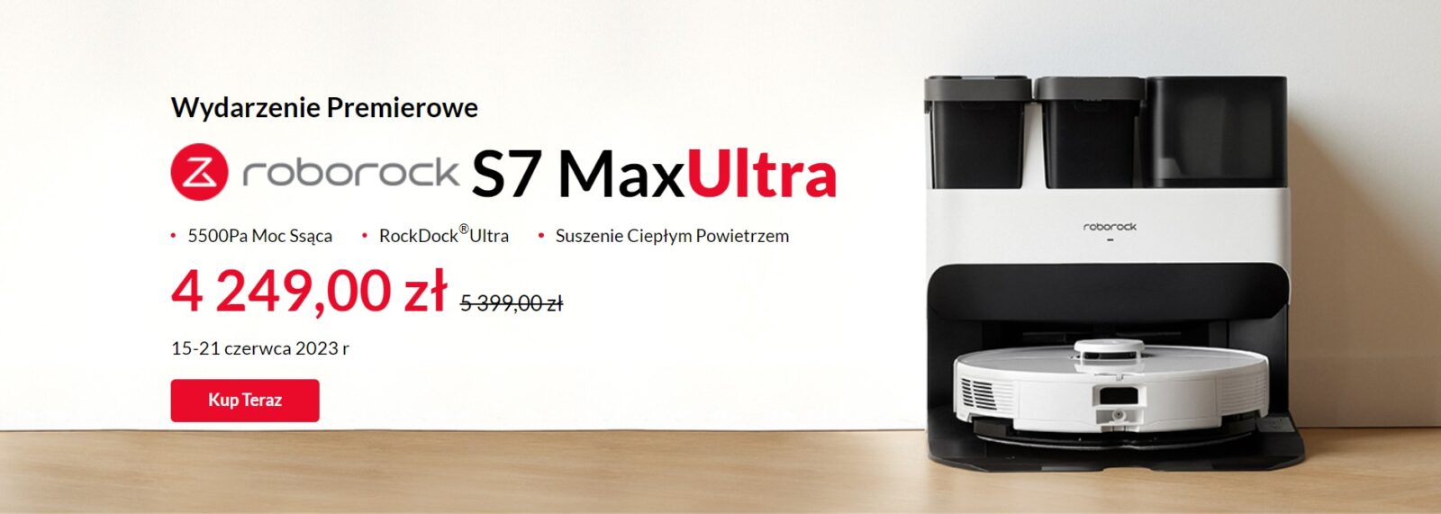 Robot odkurzający Roborock S7 Max Ultra dostępny jest w przedsprzedaży trwającej od 15 do 21 czerwca. W tym czasie możemy kupić go w dużo niższej cenie – 4249 zł zamiast 5399 zł. Warto jednak pamiętać, że dostępnych jest jedynie 120 sztuk, więc trzeba się spieszyć. Dla 100 pierwszych zamówień zostały przygotowane atrakcyjne prezenty, dlatego, jeśli właśnie szukacie takiego urządzenia, nie ma co się dłużej zastanawiać.
