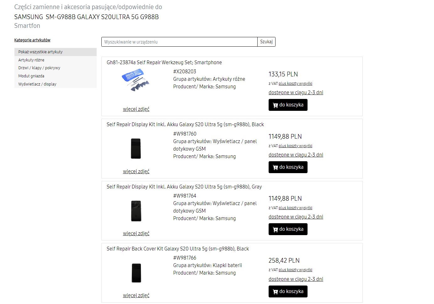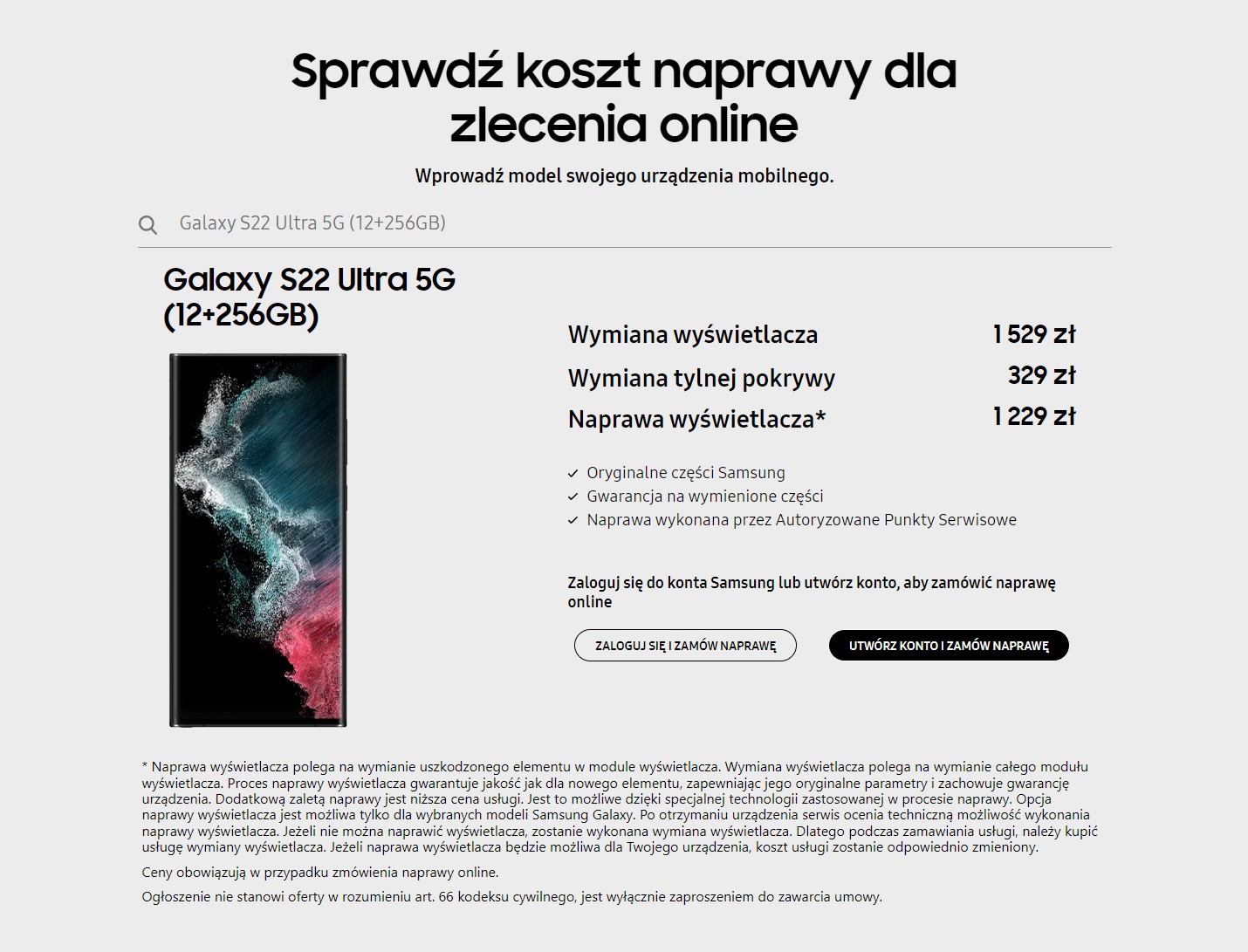Na tej stronie można zerknąć na koszty części do poszczególnych modeli. Wiadomo, w przypadku tych najnowszych ceny są znacznie wyższe, bo przykładowo chcąc wymienić stłuczony ekran w Galaxy S22 Ultra, musimy zakupić pakiet wyświetlacz + panel dotykowy, którego cena wynosi aż 1441,47 zł. Do tego trzeba jeszcze doliczyć 133,15 zł za zestaw narzędzi do naprawy. Kiedy natomiast będziemy chcieli dokonać takiej samej naprawy w Galaxy S20 Ultra, pakiet wyniesie nas już 1149,88 zł. Z kolei wymiana tylnego panelu w tych urządzeniach to koszt odpowiednio 323,17 i 258,42 złotych.