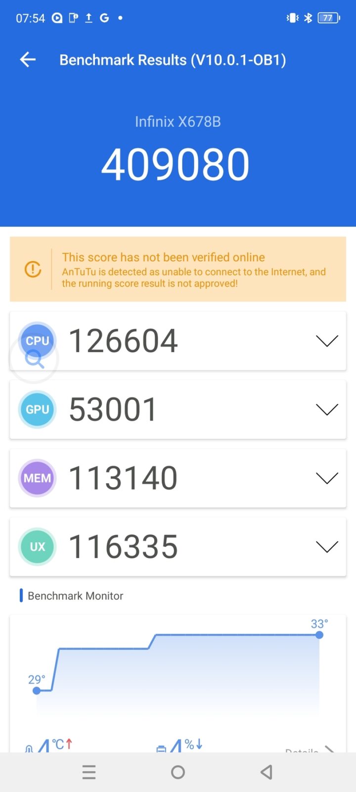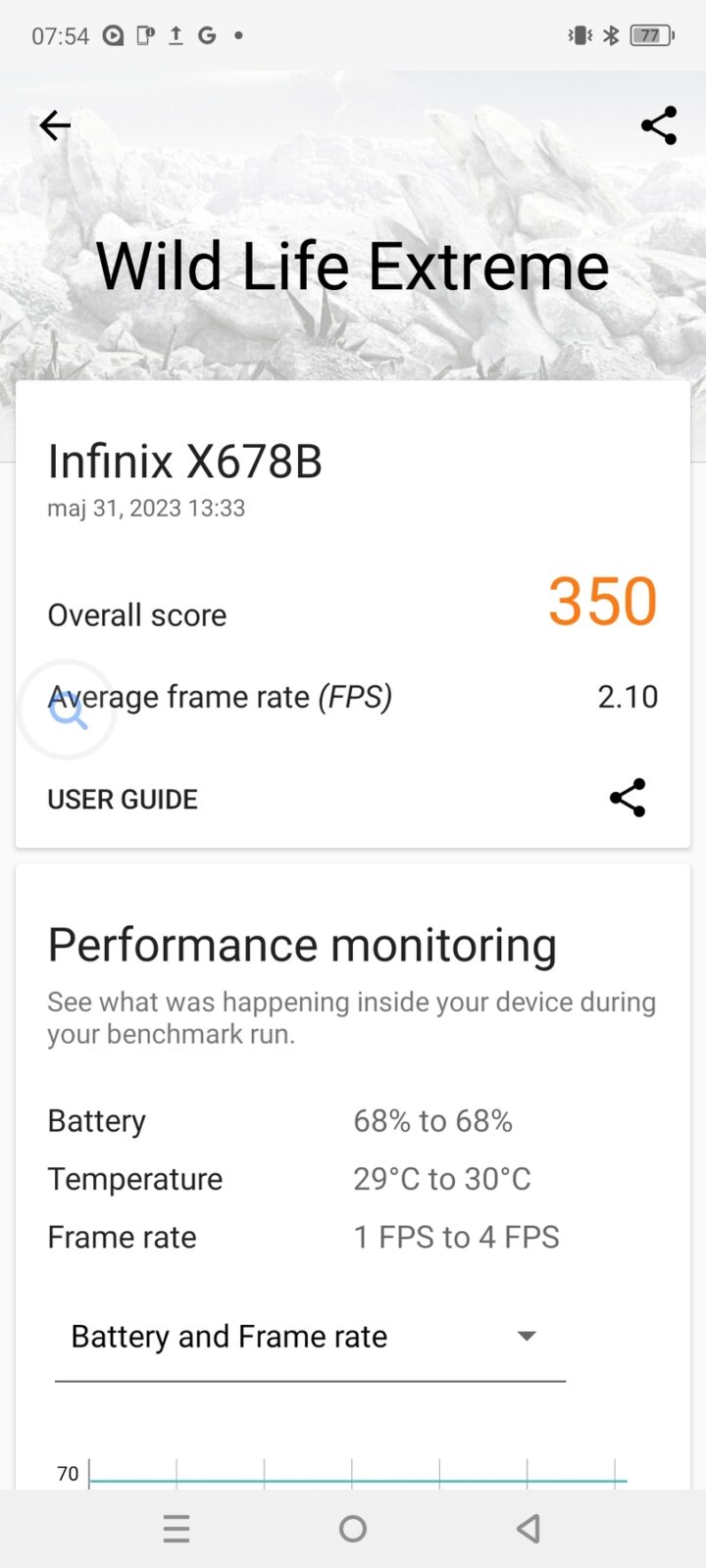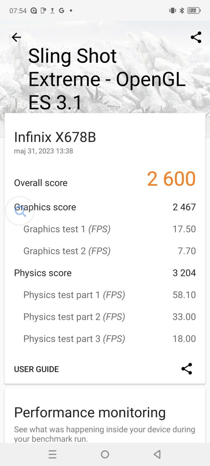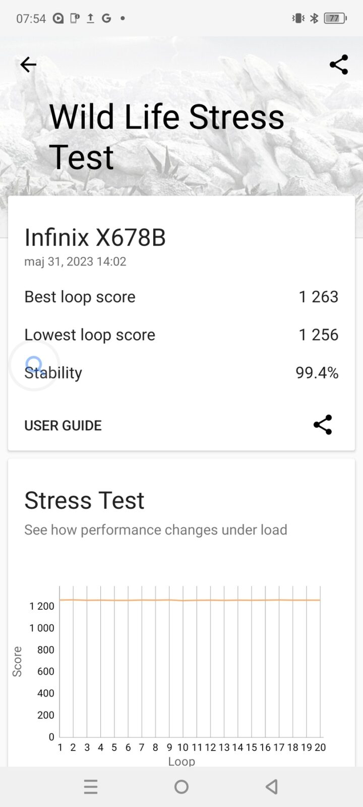 Demonem wydajności Infinix Note 30 Pro może i nie jest, ale w codziennym użytkowaniu działa bardzo płynnie i stabilnie. Z grami również nie powinno być żadnego problemu, choć w niektórych, bardziej wymagających produkcjach przyjdzie nam trochę obniżyć detale, dla zachowania płynności animacji. Na szczęście wydajność urządzenia praktycznie nie spada podczas obciążenia, co potwierdzają wyniki w stress testach na poziomie 99,4 %. Również na temperaturę obudowy nie powinniśmy narzekać – staje się co najwyżej lekko ciepła podczas dłuższego grania. To zapewne po części zasługa chłodzenia cieczą w komorze parowej, którą chwali się producent.