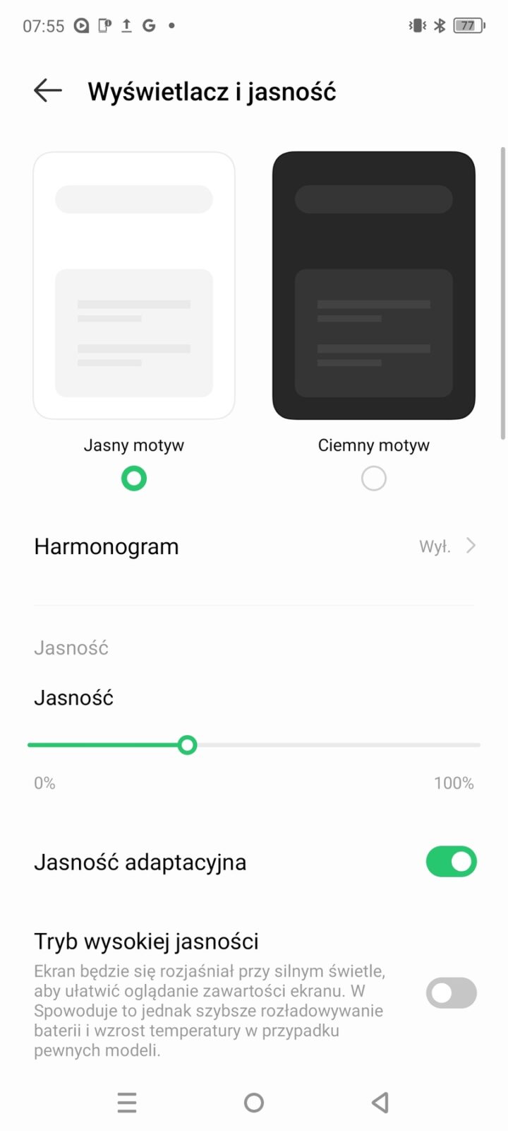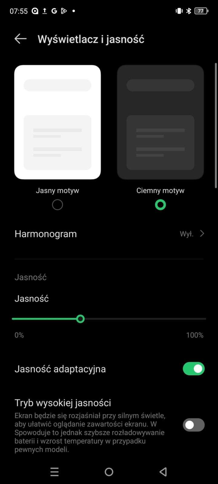 W ustawieniach znajdziemy tryb ciemny dla menu, filtr światła niebieskiego, możliwość regulacji temperatury barwowej oraz częstotliwości odświeżania ekranu. Jest również tryb zapobiegający przypadkowemu włączeniu ekranu oraz wspomniany wcześniej tryb wysokiej jasności.