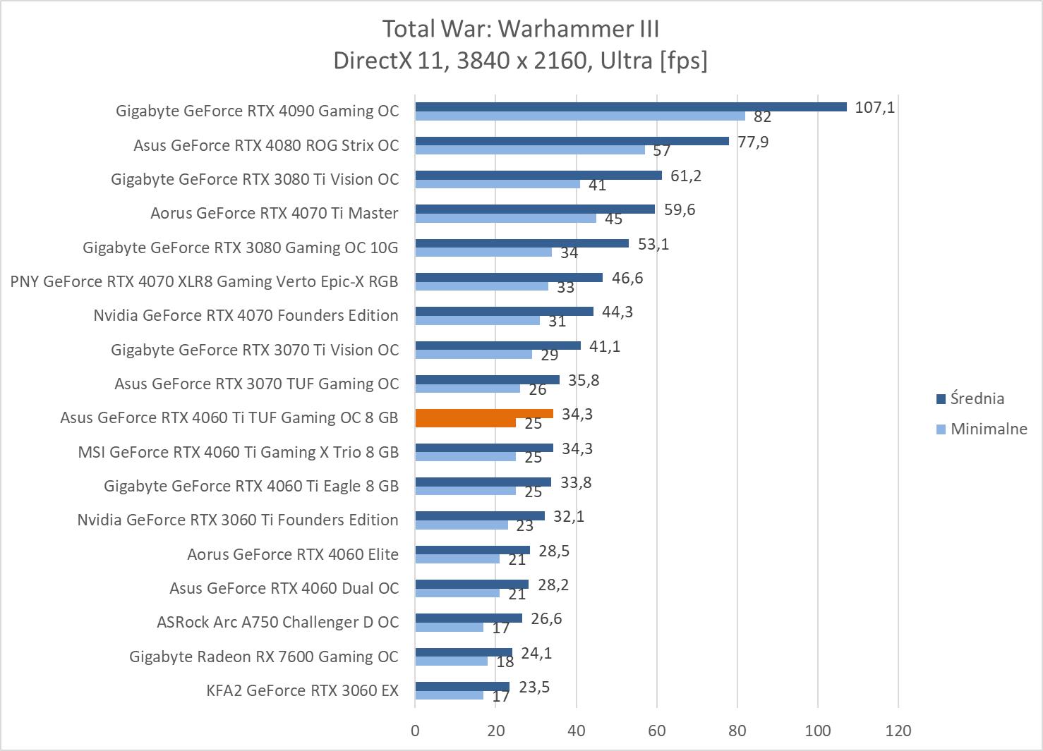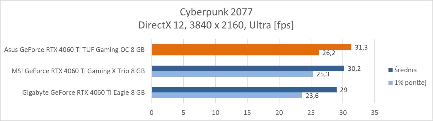 W ostatniej rozdzielczości wyniki są bardzo bliskie RTX 3060 Ti, co tylko pokazuje, jakim niewypałem jest RTX 4060 Ti.