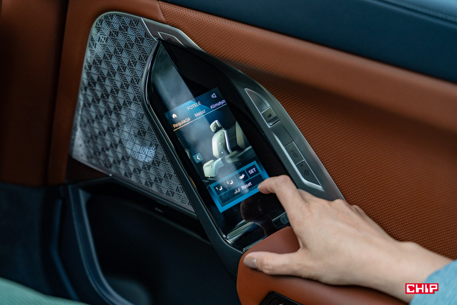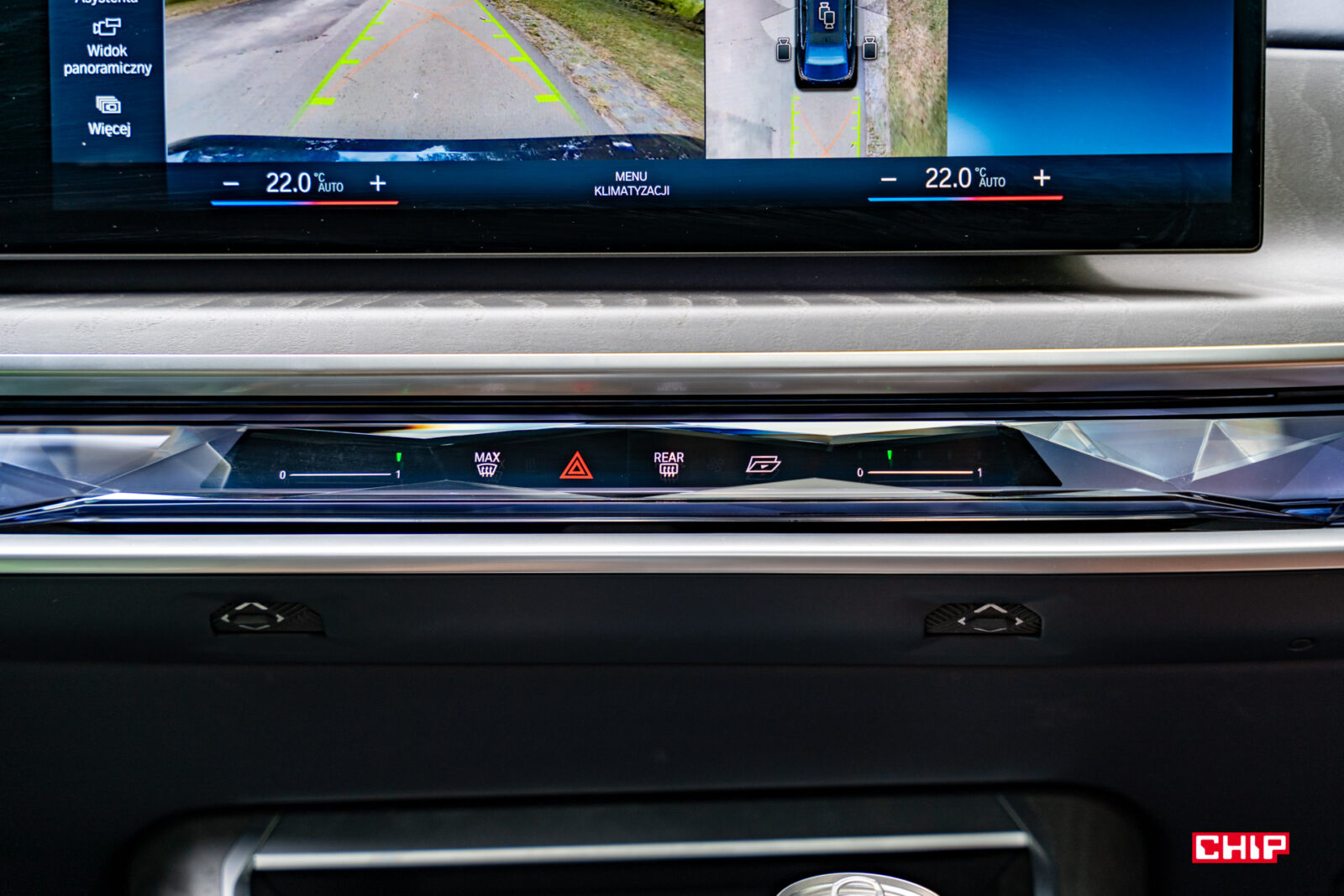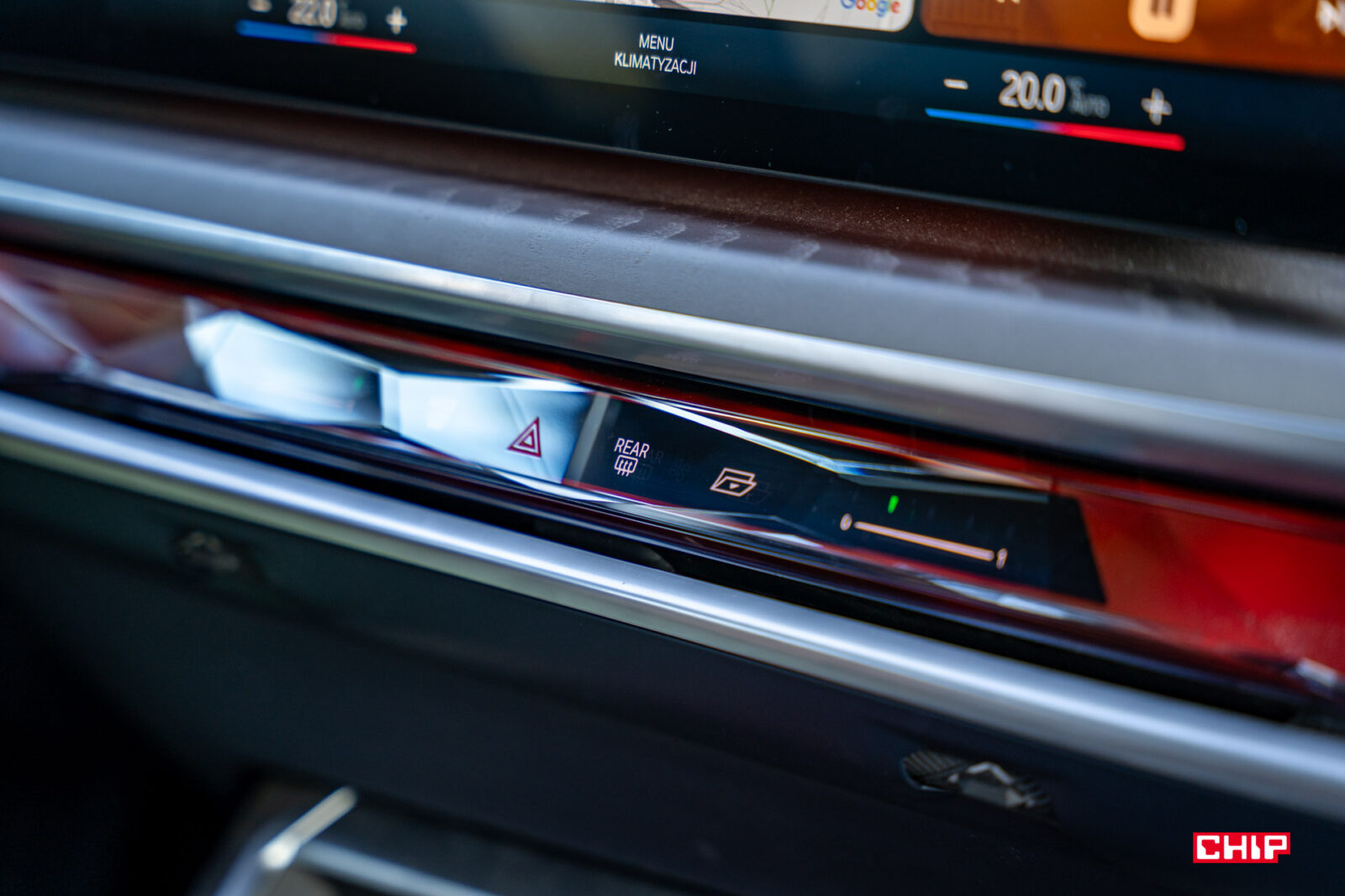 Dzięki temu wnętrze nagrzewa się nieco mniej. Oczywiście grzeje się, ale wpływ na to mają też dosyć mocno nagrzewające się ekrany. Wracając jeszcze na moment do panoramicznego dachu, muszę przyczepić się do przycisku przesuwania rolety dachowej. Drogie BMW, czy w aucie, którego cena zbliża się do miliona złotych, nie można było zrobić dedykowanego kawałka plastiku z nadrukiem? Mamy tu identyczny przełącznik jak w pozostałych modelach BMW, którego grafiki sugerują, że panoramicznych dach można też otworzyć. Nie można, bo tafla szkła biegnie przez prawie całą powierzchnię dachu. Ot taka mała pierdoła, która delikatnie psuje odbiór wypasionego wnętrza.