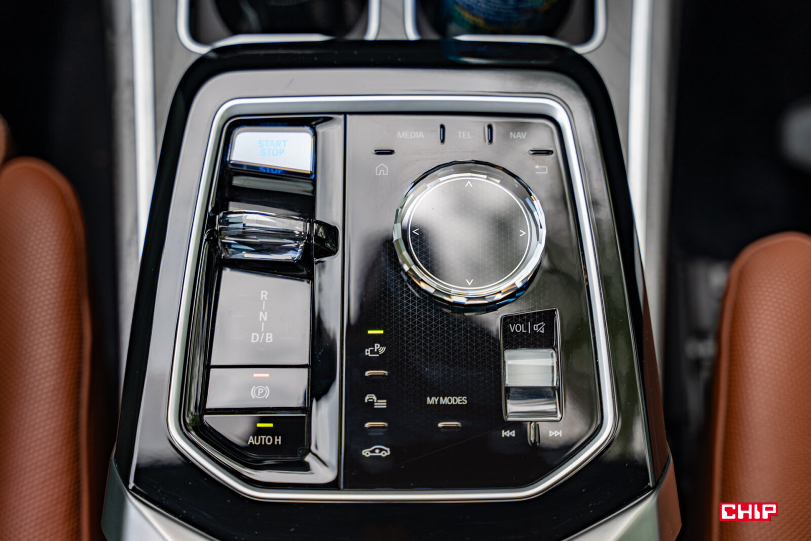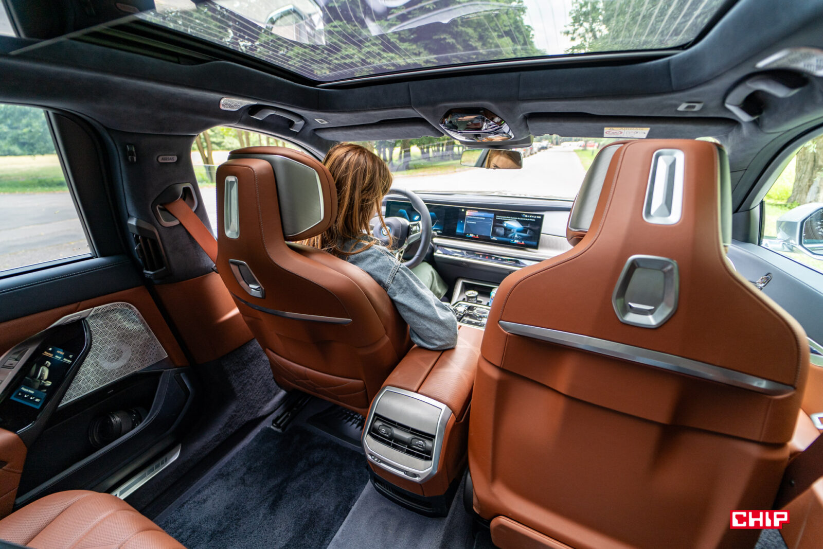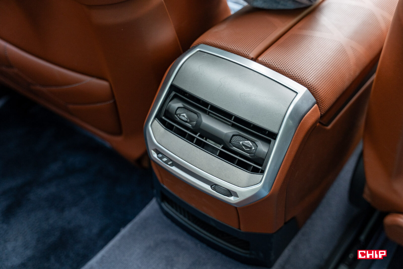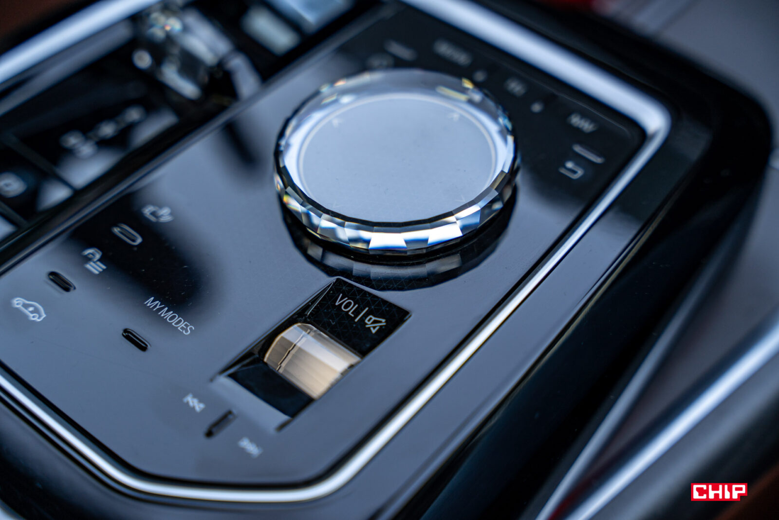 Dzięki temu wnętrze nagrzewa się nieco mniej. Oczywiście grzeje się, ale wpływ na to mają też dosyć mocno nagrzewające się ekrany. Wracając jeszcze na moment do panoramicznego dachu, muszę przyczepić się do przycisku przesuwania rolety dachowej. Drogie BMW, czy w aucie, którego cena zbliża się do miliona złotych, nie można było zrobić dedykowanego kawałka plastiku z nadrukiem? Mamy tu identyczny przełącznik jak w pozostałych modelach BMW, którego grafiki sugerują, że panoramicznych dach można też otworzyć. Nie można, bo tafla szkła biegnie przez prawie całą powierzchnię dachu. Ot taka mała pierdoła, która delikatnie psuje odbiór wypasionego wnętrza.