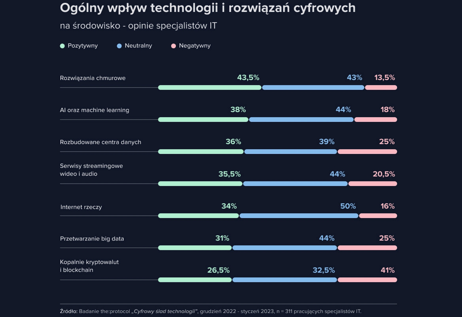 Badacze z the:protocol zapytali specjalistów z dziedziny IT o wpływ na środowisko poszczególnych technologii i rozwiązań cyfrowych. Eksperci z tej branży negatywnego wpływu na środowisko dopatrują się przede wszystkim w kopalniach kryptowalut i technologiach blockchain – stwierdza tak 41% ankietowanych. Branża IT nie jest jednak zbyt sceptyczna wobec dziedzin, które są jej bliskie – zdecydowana większość osób ocenia rozwiązania chmurowe, AI czy nawet rozbudowane centra danych za w znacznej mierze pozytywne lub neutralne dla środowiska. To dziwne, biorąc pod uwagę, że generatywne AI to internetowy odpowiednik plastiku, a stworzenie jednej odpowiedzi lub grafiki kosztuje spore zasoby energii.