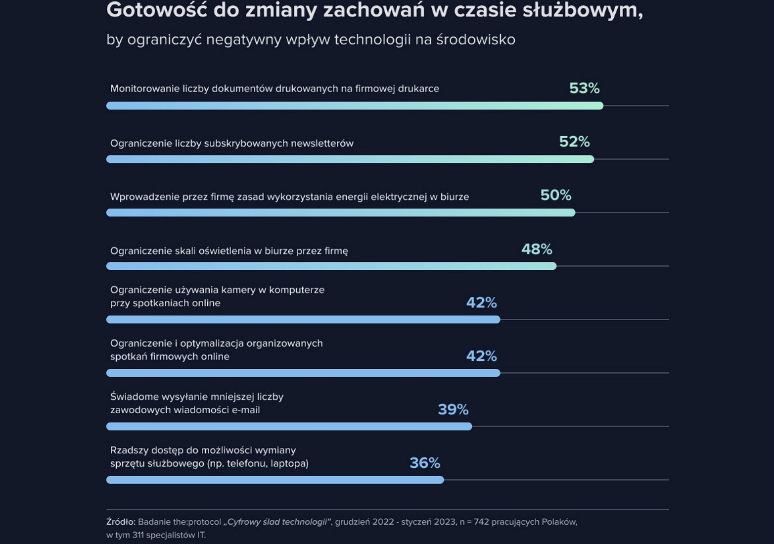 Nie jest jednak tak, że nie jesteśmy gotowi na ograniczenie pewnych zachowań, szczególnie podczas pracy. Ponad połowa ankietowanych jest gotowa na monitorowanie liczby dokumentów drukowanych na firmowej drukarce oraz na ograniczenie liczby subskrybowanych newsletterów. Połowa pracowników z ankiety byłaby za reglamentacją wykorzystania energii elektrycznej w biurze, a 48% widzi szansę w ograniczaniu skali oświetlenia w biurze. Gdy zaś chodzi o pracę zdalną, 42% dostrzega szansę w ograniczeniu użycia kamery w komputerze podczas spotkań online oraz w ograniczeniu i optymalizacji spotkań online.