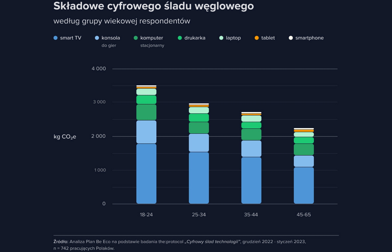 Według analizy Plan Be Eco każdy ankietowany wyemituje średnio 2,6 tony CO2 w wyniku korzystania z elektroniki użytkowej przez rok. Aby zrównoważyć taką emisję, potrzeba 370 zdrowych, dorosłych drzew. Za taki ślad węglowy w największym stopniu odpowiada czas spędzony z… telewizorami oraz konsolami do gier, a następnie komputerami osobistymi. Smartfony, choć w kieszeni niemal każdego ankietowanego, nie są według analizy Plan Be Eco źródłem znacznych emisji dwutlenku węgla.